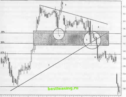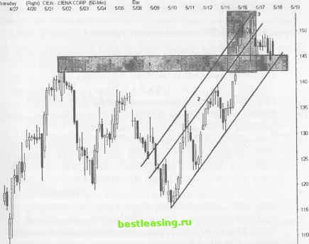 рые уверены в том, что могут открывать короткие позиции (шор-тить) на уровне второго максимума, в расчете на 100%-ое падение цены. Другие грабят себя сами, довольствуясь лишь небольшими прибылями, хотя будь они чуточку терпеливее, могли бы заработать во много раз больше. Следующий установочный набор иллюстрирует важность изучения графического полотна и необходимость идентификации скрытых преград перед открытием позиции. ПРОРЫВ КАНАЛА Когда происходит прорыв параллельных трендовых линий в любом направлении, начинается расширяющееся ценовое движение. Этот прорыв параллельного ценового канала, как правило, дает надежный сигнал и не сопровождается хаотическими колебаниями цены. ОПИСАНИЕ Ценовые каналы образуются двумя параллельными трендо-выми линиями, однако каждая из этих трендовых линий может быть проведена не через три, а через две точки. Гармонические параллельные линии часто обозначают уровни поддержки/сопротивления внутри важных границ канала. Ценовые бары могут резко расширяться, когда цена прорывает канал в ту или иную сторону, вне зависимости от угла наклона канала. Последующий прорыв канала может дать заблаговременный сигнал на то, что цена образует зону застоя вдоль границ канала, и диапазон баров будет сужаться. Интенсивность расширения ценовых баров часто отражает количество ударов цены о границы канала перед его прорывом. Цена возвращается для тестирования прорыва канала, и только потом продолжает движение вверх или вниз. Стратегия, использующая ценовые каналы, работает либо на прорыве трендовых линий, либо на развитии моментума. Четко обозначенные гармонические линии позволяют точно определить вход в свинг-позицию с минимальным риском потерь. Попьггайтесь осуществить трейд в пределах ценового канала перед тем, как начнется расширение ценовых баров. Модель будет давать сигнал на намеченную цель одним или двумя барами перед началом движения. ТАКТИКИ УСТАНОВОЧНОГО НАБОРА (РИСУНОК 7.6) Восходящий канал акции Ciena использует предыдущий максимум для того, чтобы инициировать превосходную модель для открытия короткой позиции. Проанализируйте, что происходит, когда гэп на отрыв (1) на отметке 145 превращается в гэп на излет двухнедельного ралли. Параллельные ценовые каналы строят комплексные гармонические (2) линии в пределах своих границ. Идентифицируйте ценовые каналы в ранней стадии их развития и используйте их до того, как они будут нарушены. Начните тестировать параллельные линии, как только выявятся три последовательных максимума или минимума. С большой осторожностью работайте с прорывами каналов, когда цена, устремившись вверх к новому максимуму (4), первый раз тестирует предыдущий максимум. Помните, что при таком развитии ситуации возможен разворот в пределах модели Двойной Вершины . Цена ударяется о верхнюю трендовую линию (3), и проявляет готовность к прорыву за ее пределы после тестирования гармонической линии. Оперативно подготовьте открытие длинной позиции, если восходящие ценовые бары образуют застой против верхней трендовой линии. Акция Ciena внезапно прорывает гармоническую линию вниз и выстраивает зону застоя на вершине гэпа на отрыв (1). Ложный прорыв подает сигнал тревоги, призывая внимательно присмотреться к ценовой модели. ОСУЩЕСТВЛЕНИЕ ТРЕЙДИНГА И УПРАВЛЕНИЕ ТОРГОВОЙ ПОЗИЦИЕЙ (РИСУН