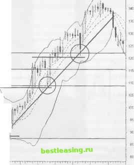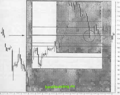 .......I................................................................................ 22 24 28 300 5 7 II 13 15 19 21 25 27 29N 3 5 9 II 15 17 19 2326 ЭОО 3 7 9 13 15 17 21 23 2830 J 5 7 11 13 18 20 24 26 28 F RealTick® ©1986-2000. Все права защищены. Используется с разрешения Townsend Analytics, Ltd СТРАТЕГИИ DIP TRIP Точку входа в рынок с минимальным риском потерь определяйте с помощью уровней отката Фибоначчи и других элементов ценового графика. Выявляйте уровни поддержки/сопротивления, которые сходятся с ключевыми уровнями отката Фибоначчи. Например, обратите внимание на разворот цены от уровня предыдущего максимума, который совпадает с 62%-ым уровнем отката после- днего ралли. Каждый раз выявляйте единственную, определяющую характер движения цены модель. Цена, как правило, откатывает от 38%-го, 50%-го и 62%-го уровней Фибоначчи, но часто, перед разворотом, можно наблюдать проскакивание этих уровней. По одной из классических стратегий, перед тем, как осуществить торговую сделку с применением классических уровней Фибоначчи, ценовые развороты рассматриваются в нескольких временных диапазонах (см. 38-62 в разделе Применение (Applications) настоящей главы). Такой метод 3D анализа позволяет идентифицировать точки открытия позиций с минимальным риском потерь по нескольким хаотическим колебаниям цены. В целях обнаружения естественных уровней отката - уровней поддержки/сопротивления, установите сетку Фибоначчи, которая будет охватывать все восходящее движение цены. Второе дно модели Двойное Дно чаще представляет собой лучшую отправную точку, чем фактическая точка минимума. Для более детального исследования характера ценового движения установите сетки Фибоначчи на графиках, построенных в меньших временных рамках. Эти линии охватывают точки предыдущего максимума и последовательно снижающихся минимумов. Понаблюдайте за первичными уровнями отката - не конвергируют ли они с уровнями сетки Фибоначчи. Это должно следовать из внутренней математики движения тенденции. В сильном трендовом рынке установочные наборы dip trip могут появляться один за другим. Следовательно, после каждой волны ценового движения необходимо заново анализировать состояние рынка и вносить необходимые поправки. Каждый трейд должен строиться сообразно своему потенциалу в данный конкретный момент, ведь одни тенденции обладают гораздо большим соотношением доходность/риск, чем другие. Отдавайте предпочтение тенденциям в ранней стадии развития до того, как рынок достигнет состояния перекупленности, и всегда держите наготове альтернативный вариант. Зона застоя, как правило, имеет свойство чередоваться с простыми и сложными моделями динамичных тенденций. Модели dip trip появляются в любых временных рамках и инициируют прибыльные внутридневные позиции. Простейший 5-минутный ценовой график обеспечивает эффективной структурой для обнаружения этого многообещающего установочного набора. Разнообразьте анализ внутридневных установочных наборов различными оригинальными методами. Обычные ценовые откаты, которые происходят в первый час торговой сессии или наблюдаются на 2-дневном графике, могут указывать на превосходные dip-позиции. Постарайтесь отслеживать уровни откатов цены по графикам, построенных в нескольких временных рамках, лишь в том случае, когда открытая Вами позиция удерживает не более нескольких минут, достаточно отслеживать ее в одном временном диапазоне. Помните, 