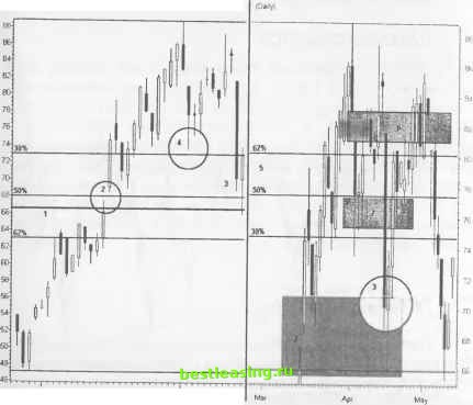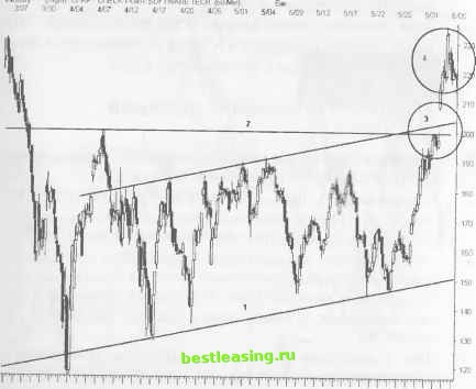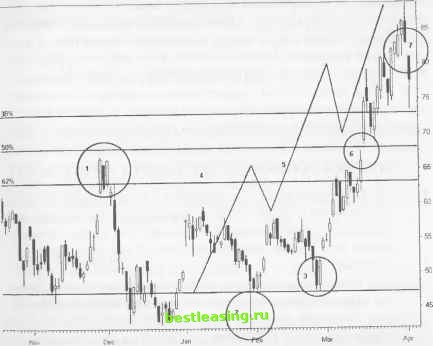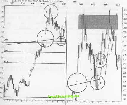 РИСУНОК 8.7 Daily (RigM) BBV BEST BUy CO INC Bar ![]() RealTick® ©1986-2000. Все права защищены. Используется с разрешения Townsend Analytics, Ltd. Сильный разворот тенденции следует за длинной черной свечой (3). Проанализируйте, каким образом заполняется гэп в процессе внутридневного движения цены. Перейдите к рассмотрению ценового движения во временных рамках, на порядок меньших искомых, в целях уменьшения риска потерь. Как только гэп заполнится, можно открывать агрессивную позицию. Используйте зону застоя вблизи диапазона 63-64 для выставления stop-ордеров, ограничивающих убытки. Вторую агрессивную позицию можно открывать, как только цена начнет подниматься выше минимума предыдущего бара, - это сигнал к разворотной модели Двойного Дна в наименьших временных рамках. Выставляйте stop-ордера, ограничивающие убытки, под предыдущим минимумом. Глава 8 Dip Trip (кратковременное погружение) РИСУНОК 8.8 Daily (Le ) ВВУ BEST 6UV СО INC Bar ![]() 23 25 29М 3 7 9 13 15 17 21 23 27 29 3IA 5 7 11 13 17 RealTick® ©1986-2000. Все права защищены. Используется с разрешения Townsend Analytics, Ltd. Протяните новую сетку Фибоначчи (5) через ландшафт коррекции ABC - это поможет Вам определить уровень сопротивления при отскоке цены. Цена молниеносно пробивает сопротивление модели Двойная Вершина (4) (7), но после отскока останавливается на 62%-ом уровне отката. Здесь необходимо закрыть позиции, так как уровень сопротивления достаточно мощный (6). Многие участники рынка попадают в ловушку, так как узкая зона застоя ниже отметки 80 указывает на первый откат после разворотной модели dip trip , и они открывают новую длинную позицию. Уровень сопротивления (6) преграждает путь для дальнейшего подъема цены к новому максимуму. Гэп дыра в сте- не и гэп при Двойной Вершине также снижают шансы дальнейшего роста цены акции. ДОХОДНОСТЬ/РИСК Данный установочный набор лучше всего работает либо внутри, либо вблизи гэпа на отрыв. Вслед за вертикальным ростом цены после разворота происходит несколько откатов, пока цена не достигнет уровня 70. Уровень сопротивления, расположенный выше нарушенной модели Двойная Вершина , способствует значительному увеличению риска потерь при дальнейшем подъеме цены. Установочный набор появляется на волне С коррекции ABC, что увеличивает доходность позиции, но для начала цена должна вернуться к минимальному значению волны А, и только потом она может устремиться вверх. ПЕРВЫЙ ОТКАТ Первый контртренд после прорыва промежуточного уровня максимума обеспечивает возможность открытия длинной позиции с минимальным риском потерь, как только ценовое движение выявит свои основные свойства. При большом количестве участников цена способна прорвать предыдущий уровень сопротивления. После каждого очередного этапа понижения, активизируются покупательские настроения участников рынка. Таким образом, цену при падении поддерживают новые гэпы или расширяющиеся свечи. ОПИСАНИЕ Определите точки нарушения Тройной Вершины (3 rd watch), уровни прорыва ценового канала или другие важные прорывы цены. Найдите различные типы уровней поддержки на этих уровнях прорыва. Тщательно наблюдайте за барами разворота и установите сетку Фибоначчи от точки последнего промежуточного минимума до точки промежуточного максимума. Основная коррекция будет проходить, согласуясь с этими уровнями прорыва. ![]() RealTick® ©1986-2000. Все права защищены. Используется с разрешения Townsend Analytics, Ltd. Пе