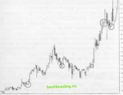 сокращая размер открытой позиции на управляемых уровнях. Остерегайтесь глубоких откатов, которые резко уменьшают размер прибыли позиции и обдумывайте новый вход в рынок, как только удостоверитесь в сохранности импульса. Переходите к рассмотрению ценовых графиков во временных рамках, на порядок меньших искомых, и изучайте детально 60-минутные модели. Основные зоны застоя на уровнях 212 и 224 обеспечивают благоприятными возможностями для трейдинга с минимальным риском потерь с осуществлением сделок по 5-минутным графикам. ГЛАВА COILED SPRING (ЭФФЕКТ СПРУЖИНИВАНИЯ) СВОЙСТВА Рынок постоянно циркулирует между взрывным характером сильной активности и состоянием относительного спокойствия. Такой естественный пульсирующий характер рынка между его вдохом и выдохом позволяет цене шаг за шагом преодолевать новые уровни, тщательно их тестировать, а затем устремляться вверх или разворачиваться обратно вниз в предварительно означенные территории рыночного пространства. По мере развития цикла в направлении свежего импульса, на ландшафте ценового графика появляются сигналы, которые улавливаются свинг-трейдерами и используются ими для идентификации пробуждающихся тенденций, в то время как основная часть рыночной толпы дожидается более поздних сигналов от рынка. МЕХАНИЗМ ТРЕЙДИНГА Рынок изменяет свой характер, как только его участники теряют доверие к существующему направлению движения цены. При этом вступает в силу негативная обратная связь, которая выстраивает сужающийся ценовой диапазон, находящий свое отражение во многих популярных графических моделях. Треугольники , Флаги , Вымпелы - все они демонстрируют подобное, лишенное направления, хаотическое колебание цены между определенными границами. Снижение волатильности также инициирует психологическое состояние толпы и механизм движения цены, что порождает сигнал coiled spring (эффект спружинивания). Многие прогнозируемые ценовые диапазоны никогда не появляются в определенных классических моделях, поэтому свинг-трейдеры должны постоянно, на основе своих наблюдений за графиками, определять, какие из благоприятных условий для трейдинга действительно имеют место быть. Один из самых эффективных методов анализа больше внимания уделяет исследованию зоны застоя ценовых баров, а не ценовому диапазону, как таковому. Эта пустая зона указывает на новые тенденции и идентифицирует точки входа в рынок с минимальными рисками потерь. Установочный набор coiled spring находит такие почти неуловимые области посредством анализа семи последних баров (метод NR7). Этот очень слабый сигнал представляет собой самый узкий диапазон последних семи баров. Ценовой бар, непосредственно следующий за NR7, очень часто инициирует значительное расширение ценовых диапазонов. Когда цене не удается совершить сильный выпад немедленно, прорыв ее может все равно произойти через 1-3 бара. Иногда появление другого NR7 при следующем баре (NR7-2) дает более сильный сигнал, так как шансы на быстрый прорыв цены растут. После того как зона застоя абсорбирует нестабильность предыдущей тенденции, начинает формироваться новая тенденция. Новый импульс либо продолжает тенденцию, либо способствует ее развороту. Указывать на начало таких активных рыночных условий может отдельный расширяющийся ценовой бар. Установочный набор coiled spring д