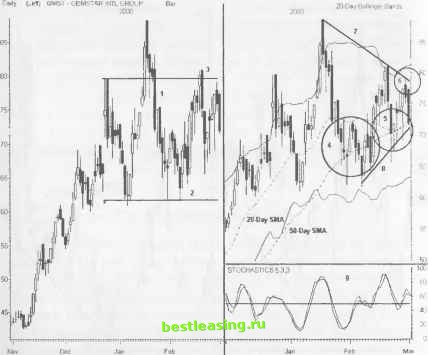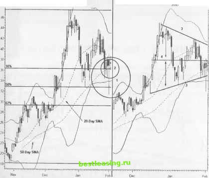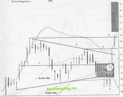 Цена обычно не выходит за пределы 50%-го уровня отката предыдущей тенденции. Перед окончательным прорывом цена трижды ударяется о вершину модели и о нижние трендовые линии. Прорыв обычно наблюдается на расстоянии 2/3 от всего расстояния, которое должна пройти цена от стартовой точки модели и до ее прогнозируемой вершины. Чаще всего NR7 появляется в середине Треугольника или напротив одной из трендовых линий. Модель Треугольник может сформироваться с барами диапазона NR7 или без них. Четкие сжатые ценовые бары позволяют открывать позиции с минимальным риском потерь внутри моделей, как раз перед ценовым прорывом. Будьте осторожны, если сигнал появляется слишком рано внутри формирующейся модели - есть шанс, что до некоторого времени ничего интересного происходить не будет, до тех пор пока большинство трейдеров не ринется искать новые благоприятные возможности. ТАКТИКИ УСТАНОВОЧНОГО НАБОРА (РИСУНОК 9.4) Длинный молот достиг при тестировании предыдущего минимума и 50%-го уровня отката (1). Цена затем закрылась выше 50-дневного среднего скользящего SMA (2). Трендовые линии формируются от верхних и нижних границ модели (3) под одинаковым углом, но в противоположном направлении. Трендовые линии образуют среднюю линию (4) Треугольника на равных расстояниях от вершины и дна модели. Ценовое движение разворачивается вокруг этой горизонтальной оси. ТРЕЙДИНГ И УПРАВЛЕНИЕ ПОЗИЦИЕЙ (РИСУНОК 9.5) Средняя линия Треугольника указывает на естественный размах цены. NR7 демонстрирует среднюю линию точно между 20-дневными SMA и 50-дневными SMA. РИСУНОК 9.4 Daily (Led) AFCI ADVANCED FIBRE COMMUNIC 2000 20-Day Bollinger Bands ![]() RealTick® ©1986-2000. Все права защищены. Используется с разрешения Townsend Analytics, Ltd. Покупайте немедленно или как можно раньше, как только цена поднимется выше 5-дневного диапазона застоя (6). Выставьте stop-loss-ордер, фиксирующий потери, ниже первого диапазона NR7, вблизи отметки 36. Акция совершает прорыв на следующем баре и устремляется к новому максимуму, вблизи которого и закрывается. Закрытие позиции на уровне 43 перед завершением регулярной торговой сессии дает возможность зафиксировать серьезную прибыль. Однако прорыв модели Треугольник дает цене шанс подняться выше и переступить через уровень максимума модели (5). Обдумайте возможность выложить деньги на стол и идите отдыхать. Следующий ценовой бар выдвигает цену за пределы верхней полосы Боллинджера (7). Тактику закрытия позиции обдумывайте перед входом в рынок, когда только это бывает РИСУНОК 9.5 Daily (Right) Af CI - ADVANCED FIBRE COMMUNIC Bai UP (P~20) DN (P=20) MA(P=20) MA(P=50) ![]() 7 8 9 10 13 14 15 16 17 20 21 22 23 27 28 29 30 31 J 4 5 6 7 10 11 12 13 14 18 19 20 21 24 25 26 27 28 31 F 2 3 4 7 8 RealTick® ©1986-2000. Все права защищены. Используется с разрешения Townsend Analytics, Ltd. возможно. Прибыль при последующем ценовом баре составляет 10 пунктов, а весь бар рисуется за пределами полосы. Стратегия stop-ордера, фиксирующего прибыль, применяемая для убегающего тренда, захватывает часть такого ценового движения. ДОХОДНОСТЬ/РИСК Риск потерь остается минимальным, как и в других случаях применения стратегии coiled spring . Потери 2 пунктов против потенциальной прибыли 20 пунктов. Четкие уровни сопротивления на отметках 44 и 48 дают возможность легко определить цель позиции и составить торговый план. Нарушение нисходящей трендовой линии в пределах модели все-таки может принести прибыль в размере 2 пунктов, если позиция была открыта рано. Ри