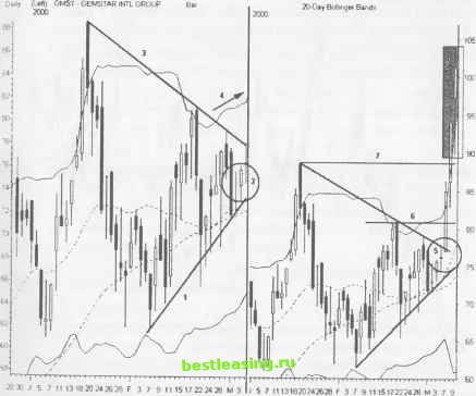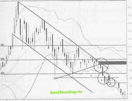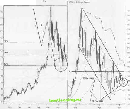 РИСУНОК 9.7 ![]() RealTick® ©1986-2000. Все права защищены. Используется с разрешения Townsend Analytics, Ltd. ДОХОДНОСТЬ/РИСК Данный установочный набор демонстрирует превосходное соотношение доходность/риск, если трейд осуществляется на ценовом баре, следующем за сигналом, поданным coiled spring . Задача минимум сводится к небольшой прибыли при соотношении 2:1, если же удерживать позицию открытой на протяжении трех дней, соотношение достигнет 9:1. Реально, несколько свинг-трейдеров будут держать свои позиции открытыми на протяжении серий расширяющихся баров до уровня сопротивления. Затем они будут открывать позиции после прорыва уровня при нарастании риска потерь, так как цена будет несколько раз откатывать. FAILURE COIL II (РАЗОРВАННАЯ ПРУЖИНА II) Данный установочный набор напоминает свинг-трейдерам, что успех долгосрочной позиции зависит от вероятности события и от управления риском потерь, а не от интерпретации моделей. Самые лучшие, почти идеальные, установочные наборы coiled spring могут нарушиться в любой момент времени или в любом месте. Когда все рушится, следуйте написанному Вами торговому плану или же горите в аду . К счастью, даже в самом пекле ада можно время от времени получать неплохие прибыли. ОПИСАНИЕ См. Failure Coil I (разорванную пружину I). Разорванные пружины (failure coils) появляются из комплексных моделей или стандартных установочных наборов coiled spring . Когда они внезапно появляются в неожиданном месте, свинг-трейдеры быстро приспосабливаются к новым условиям, в то время как основная часть рыночной толпы угождает в ловушки. Так как эффективная стратегия рассчитана на то, что сигнал, поступающий от диапазона NR7, дает равные шансы на прорыв цены в обоих направлениях, необходимо, чтобы торговый план включал в себя двустороннюю реакцию на большинство стандартных сигналов coiled spring . ТАКТИКИ УСТАНОВОЧНОГО НАБОРА (РИСУНОК 9.8) Акция Sandisk демонстрирует стандартный установочный набор dip trip или coiled spring)). Резкое ралли разворачивается и откатывает, рисуя классическую коррекцию ABC (2). Сетка Фибоначчи (1), протянутая через все ралли, указывает на бычий характер развития дальнейшего ценового движения. Волна С завершается отчетливой моделью Двойное Дно (3) на 62%-ом уровне отката. Два дна инициируют широкий размах колебаний цены вокруг оси (7), где цена достигает круглого числа 100. При коррекции образуется большой бычий Флаг (4) с моделью Двойное Дно в дальней экстремальной точке модели. РИСУНОК 9.8 Daily (ball) SNDK SANDISK CORP 2OD0 ![]() RealTick® ©1986-2000 Все права защищены. Используется с разрешения Townsend Analytics, Ltd. дится делать достаточно жесткий выбор после внушительной прибыли. Лучшая стратегия диктует выложить некоторую сумму средств на стол и передохнуть. Следующий ценовой бар с гэпом проходит сквозь уровень минимума (4), выходит за пределы полосы Боллинджера и ведет к отскоку от благоприятных условий для коротких продаж. Небольшая модель дожи указывает на еще один вход в рынок, когда цена падает ниже 60. ДОХОДНОСТЬ/РИСК Данный установочный набор предлагает открытие длинных позиций с высоким риском потерь. Классическая коррекция и модель Флаг указывают на прорыв цены вверх и новое ралли к пре- Движение цены опирается на трендовую линию (6), исходящую из точки минимума модели и идущую вверх по восходящему каналу Флага . Крошечный диапазон NR7 появляется (5) на стыке нисходящего канала и восходящей трен