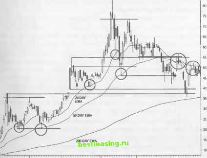 баром. Уровень сопротивления превращается в уровень поддержки, если цена пробивает его вверх, и наоборот, если цена пробивает уровень вниз, то поддержка превращается в сопротивление. Четкая идентификация уровня S/R и выявление установочного набора для входа в рынок вдоль этого уровня - залог успешной работы свинг-трейдера. Уровни поддержки/сопротивления существуют на всех графиках в любых временных диапазонах. Прорыв этих уровней происходит при резком росте активности покупателей или продавцов. Осуществив прорыв одного из уровней S/R, цена устремляется к следующему уровню S/R. Этот механизм лежит в основе многих торговых стратегий. Как известно, согласно классической свинг-стратегии, трейдер покупает акции на уровне поддержки и продает их на уровне сопротивления. Следовательно, эти уровни определяют также прибыль и риски потерь. Ищите благоприятные возможности для покупок на уровне поддержки, ближайший уровень сопротивления от которого достаточно далек, и наоборот, продавайте акции на уровне сопротивления, когда ближайший уровень поддержки лежит намного ниже. Но всегда убеждайтесь в том, что на графике не скрыты какие-либо опасные преграды. Ориентир на высоко стоящий одинокий уровень сопротивления может принести вам плачевный результат. Качественный прогноз движения цены, сделанный на основе уровня S/R, существенно влияет на результат сделки. Опытный трейдер быстро определяет местонахождение уровней S/R и просчитывает их влияние на каждую сделку. Начните тренироваться на компактных шаблонах графиков, содержащих все типы уровней S/R. Затем изучите отдельные элементы уровней S/R и определите, насколько велико их влияние на соотношение вознаграждение/ риск. Выберите ценовой график за самый длительный период времени и идентифицируйте на нем все уровни high и low вплоть до последней цены. Особое внимание следует уделить новостям, которые, приводя в замешательство участников рынка, могут спровоцировать образование нового важного уровня S/R построением одного ценового бара. К примеру, сильный разрыв цены (gap) может не заполняться много лет. Не забывайте учитывать иерархию уровней S/R, которая определяет степень их важности. Горизонтальные уровни, сохраняющиеся длительное время, более весомы, чем уровни короткого промежутка времени. Основные уровни high и low укрепляют уровни поддержки/сопротивления сильнее, чем средние скользящие (moving average) или какие-либо другие производные цены. Скрытые уровни предлагают более очевидные возможности, нежели хорошо известные уровни, предлагающие стратегии затухания и на покупках, и на продажах. Уровень S/R укрепляется, когда наблюдается схождение многих уровней S/R к одной и той же цене, и уровень S/R ослабевает, когда какое-либо препятствие блокирует сильное направленное движение цены. ТИПЫ УРОВНЕЙ ПОДДЕРЖКИ/ СОПРОТИВЛЕНИЯ (S/R) Цена, выстроенная по горизонтали, определяет общий вид уровней поддержки/сопротивления. Именно эти важные максимумы (highs) и минимумы (lows) цены представляют театр военных действий между рыночными медведями и быками и несут на себе эмоциональный налет, являющийся тем последним фактором, который и определит дальнейшее направление движения цены. Рынок имеет тенденцию рисовать дно при больших торговых объемах и затем тестировать этот уровень поддержки повторно. В течение определ