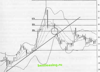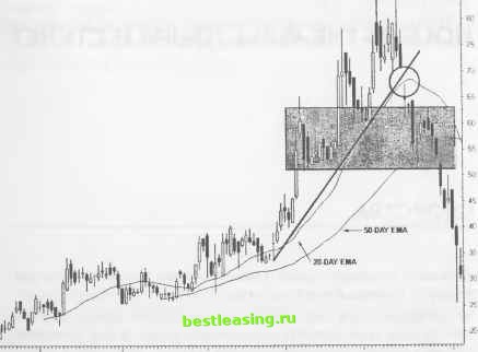 РИСУНОК 11.1 Гэп, образующий hole-in-the-wall , завершает 50-пунктовое ралли акции Breakaway. Этот внезапный прорыв цены позволяет свинг-трейдерам быстро изменить стратегию и подготовиться к нисходящей тенденции заблаговременно, намного раньше рыночной толпы. Проанализируйте, каким образом удалось модели hole-in-the-wall прорывать трендовую линию и 20-дневные ЕМА, являющиеся уровнем поддержки при формировании классической модели разворота Голова и Плечи . Daily (BigMj BWAY BREAKAWAY SOLUTIONS 2000 ![]() Dec Jan Feb Mar Apr RealTick® ©1986-2000. Все права защищены. Используется с разрешения Townsend Analytics, Ltd. упасть под собственной тяжестью. Установочный набор hole-in-the-wall ( дыра в стене ) определяет динамику этого ценового движения. После достижения нового промежуточного уровня максимума, цена при своем восходящем тренде совершает резкий разрыв ралли, когда внешние силы шокируют рыночных быков и расстраивают их психику. Объем при падении рынка превосходит объем предыдущего ралли и указывает на внезапное развитие нового нисходящего тренда. Установочный набор hole-in-the-wall завершает предшествующую тенденцию и может инициировать прибыльные благоприятные условия для трейдинга. Сопоставьте эти благоприятные возможности с шириной ценового разрыва, с интенсивностью участия в рынке и с относительной силой, прежде чем решиться на какие-либо действия. Изучите интенсивность конфликта по обе стороны рынка - это поможет выявить, готов ли рынок продолжить ралли или же он развернется и устремится к своим минимальным уровням. Данный установочный набор предлагает несколько точек открытия коротких позиций, а для агрессивных трейдеров длинные свинг-позиции. Не все модели hole-in-the-wall стимулируют формирование сильных нисходящих тенденций. Последующее ценовое движение может дать сигнал на начало динамичной тенденции противоположного направления. Или же может наблюдаться промежуточное движение цены, указывающее на формирование бокового тренда рынка, до тех пор пока гэп не будет заполнен и цена не устремится к новым вершинам. Различные вариации развития данной рыночной ситуации отражают силу шоковых новостей и последующее тестирование ценой своих уровней. Даже в случае поступления незначительных новостей, первый откат цены внутрь гэпа не заполняет его, что способствует развитию благоприятных условий для осуществления коротких продаж акций, независимо от направления формирующейся тенденции. Каждый установочный набор hole-in-the-wall обладает отличительными особенностями различной силы. Перед тем, как приступить к рассмотрению варианта открытия долгосрочной позиции, просчитайте все возможные потенциальные результаты. Необдуманные продажи акций могут завершиться уже на первом ценовом баре гэпа на излет или чуть позже, как только прояснится природа данного гэпа. Наиболее благоприятные возможности для трейдинга в данной рыночной ситуации создает установочный набор hole-in-the-wall , обычно появляющийся на откатах, тестирующих прорыв, и сжатые stop-ордера на продажу, выставленные чуть выше точек открытия, могут принести быстрые и существенные прибыли. В любом случае для того, чтобы идентифицировать лучшие моменты для входа в рынок, свинг-трейдеры должны понимать механизм работы установочного набора hole-in-the-wall . Многие стратегии держатся в стороне от рынка до тех пор, пока цена после разрыва не достигнет первого