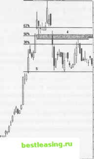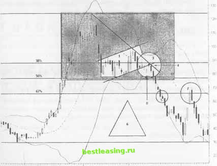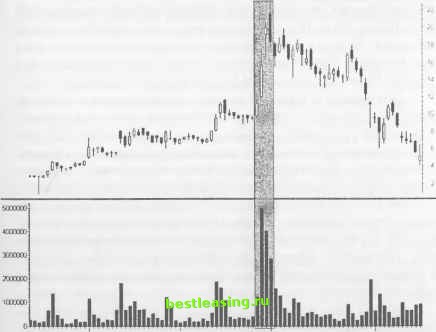 РИСУНОК 11.8 Daily (Led) ITXC - ITXC CORP 3000 ![]() ![]() 14 IB 20 22 27 29 3U 5 7 11 13 18 20 24 26 28 F 3 7 9 11 Jan I Mar RealTick® ©1986-2000. Все права защищены. Используется с разрешения Townsend Analytics, Ltd. Полосы Боллинджера стягиваются по мере сужения диапазонов свечей при пересечении трендовой линии с ценовым каналом, проходящим через минимальный уровень медвежьего Флага (3). Открытие коротких позиций сопряжено с достаточно высоким риском потерь, так как есть вероятность ложного прорыва цены вниз на предыдущем ценовом баре (8). Следующий ценовой бар расширяется при своем движении вниз и подтверждает нисходящую трендовую линию. Цена также прорывает центральную полосу Боллинджера (4). Риск в данной точке остается высоким. Лучшие стратегии коротких продаж рекомендуется применять при прорыве цены (8). Выставляйте stop-loss-ордера несколькими тиками выше минимума (8). РИСУНОК 11.9 Caily (Sight ITXC ITXC CORP Bar UP(P=20) DN <P=20) t4A(P=20i ![]() П iS 21 /3 28 30 J 5 7 II 1316 20 24 26 28 F 3 7 9 11 15 17 22 24 28 M 3 7 9 13 15 17 21 23 27 2S31A 5 7 I И 1/ 19 RealTick® ©1986-2000. Все права защищены. Используется с разрешения Townsend Analytics, Ltd. Цена продолжает снижаться и формирует перевернутую модель 3rd watch (10). И хотя позиция, открытая на предыдущем ценовом баре, имеет потенциал прибыли 3-5 пунктов, все еще сохраняется вероятность того, что цена совершит прорыв уровня предыдущего минимума. Модель Адам и Ева (9) при вершине завершает свое формирование, и цена устремляется вниз. Активные продажи акций аккумулируют моментум. Следующий уровень поддержки располагается на 62%-ом уровне коррекции. Цена пробивает этот уровень и отскакивает для его тестирования снизу (5). Падение цены ведет к формированию более долгосрочной модели первого падения (6). Модель завеса из темных облаков , расположившаяся на 62%-ом уровне коррекции (7), предлагает последнюю благоприятную возможность осуществить короткие продажи данных акций. ДОХОДНОСТЬ/РИСК Установочный набор управляет риском потерь посредством сжатых stop-loss-ордеров, выставляемых при всех потенциальных коротких позициях. Небольшие классические модели и свечи обеспечивают довольно ранними предупредительными сигналами, оповещающими о надвигающемся ценовом движении. Характерные свойства графиков, построенных в краткосрочных временных рамках, дают четкие указатели на точки открытия/закрытия позиций. Откаты цены происходят согласно графику, преподнося время от времени некоторые сюрпризы. Позиционные трейдеры более выгодно используют эти прибыльные модели, чем это делают краткосрочные трейдеры. ГЛАВА J POWER SPIKE (СКАЧОК НАПРЯЖЕНИЯ) СВОЙСТВА Каждый рынок характеризуется средним количеством своих участников, которое колеблется в зависимости от предстоящего свободного колебания курсов акций, от волатильности, а также от внешних условий, оказывающих влияние на состояние рынка. Скорость ценового движения резко возрастает, когда внезапный интенсивный рост торгового объема приводит в шоковое состояние большую половину рыночных покупателей и продавцов. Накал страстей эмоциональной толпы может активизироваться либо на новых ценовых уровнях, или же, когда тенденция приближается к зонам предыдущих рыночных баталий. Вне зависимости от места действия, финальный импульс может нанести достаточно серьезный урон ценовому движению акции, оправиться от которого порой бывает трудно даже на протяжении нескольких месяцев. МЕХАНИЗМ ТРЕЙДИНГА Power spike ( скачок на