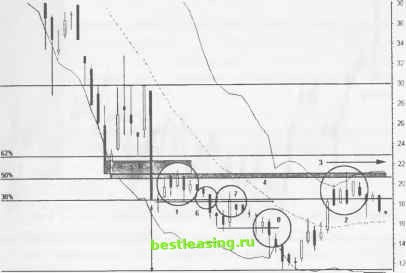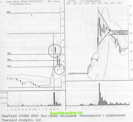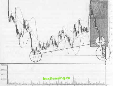 ВСПЛЕСК ОБЪЕМА ПРИ ПРОРЫВЕ ЦЕНЫ ВНИЗ (BREAKDOWN SPIKE) Прорыв важного уровня поддержки может стимулировать сильный рост торгового объема. Это означает, что некое событие приводит рыночную толпу в шоковое состояние и настолько ранит данную акцию, что вынуждает ее опуститься ниже уровня, который сохранялся на протяжении некоторого периода времени. Большинство таких разрушительных ценовых прорывов происходит тогда, когда цена растет необоснованно на ложном оптимизме, а затем резко падает, круша все надежды трейдеров. ОПИСАНИЕ Акция устанавливает четкий уровень поддержки, который сохраняется месяцами. Цена прорывает этот уровень вниз на высоком торговом объеме. Падение цены продолжается, но под меньшим углом, чем до прорыва. Модель power spike крайне редко дает сигнал на первый прорыв нисходящей тенденции. Модель имеет достаточную силу в связи с тем, что предыдущее понижение цены происходило при небольшом торговом объеме. Раненые , но уцелевшие трейдеры выдерживают позиции до цены, которая приносит значительные потери. Цена наносит удары по этому уровню поддержки и оказывает сильное давление на тех, кто в этот момент пытается выйти из рынка. Такая ситуация истощает акцию, не давая ей возможности для развития следующей тенденции. Каким образом рынок может понижаться дальше, если уже все перепродано? Ответ можно найти только, руководствуясь физическими законами: рынок продолжает падать под собственной тяжестью. ТАКТИКИ УСТАНОВОЧНОГО НАБОРА (РИСУНОК 12.4) Акции компании Marimba зафиксировали свой минимальный уровень в августе на отметке 20 (1). В течение последующих шести месяцев на графике рисует- РИСУНОК 12.4 Oaty (fight МВВА MARIMBA >\С Ва,- Volume UP (P-20) MA(P 50j ON (P-20j MA IP-20) ![]() Jul Aug Sep Get Nov Dec jai Feb Мэг Apr May RealTick® ©1986-2000. Все права защищены. Используется с разрешения Townsend Analytics, Ltd. ся медленно восходящая трендовая линия (6). Понижение цены (7) начинается в марте и продолжается до отметки 40 на небольшом торговом объеме. Восходящая трендовая линия нарушается (2). Цена тестирует минимум, зафиксированный в августе (3), затем отскакивает (4) от прорванной трендовой линии. Уровень минимума перевернутой модели 3rd watch (5) пробивается, и вступает в силу power spike . ОСУЩЕСТВЛЕНИЕ ТРЕЙДИНГА И УПРАВЛЕНИЕ ТОРГОВОЙ ПОЗИЦИЕЙ (РИСУНОК 12.5) Цена отскакивает к прорванному горизонтальному уровню поддержки (4) и дает сигнал на идеальные условия для открытия коротких позиций (1). РИСУНОК 12.5 uaily (Right; MRBA MARIMBA Ш Bar Volume UP (P=20) ON (P=20) MA(P=20] ![]() гоооосо 23 27 29 31A 5 7 It 13 17 19 24 26 28 M 3 5 9 11 15 17 19 23 25 30 5 7 9 13 15 RealTick® ©1986-2000. Все права защищены Используется с разрешения Townsend Analytics, Ltd. Цена, достигшая своего минимума в середине апреля перед прорывом вниз, указывает на скрытый гэп между уровнями 21 и 22 (5). Выставляйте stop-loss-op дера на вершине этого гэпа вблизи отметки 22. Дополнительные короткие позиции можно открывать в точках (6), (7) и (8). Обдумывайте закрытие позиций при тестировании ценой каждого предыдущего минимума или же, когда ценовой бар расширяется. Цена возвращается для тестирования 50%-го уровня коррекции господствующей нисходящей тенденции (2), (4). Полосы Боллинджера выстраиваются горизонтально и дают сигнал на разворот тенденции. ДОХОДНОСТЬ/РИСК Установочный набор предоставляет множество мелких благоприятных возможностей для трейдинга с ограниченным потенциалом прибыли, но и с ограниченным риском потерь. После модели power spi