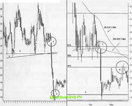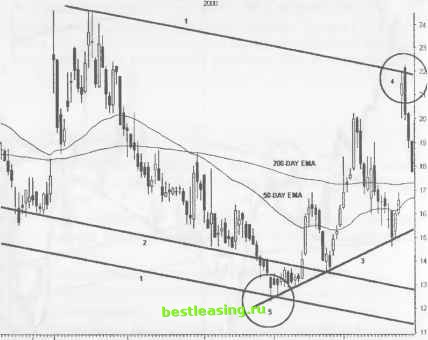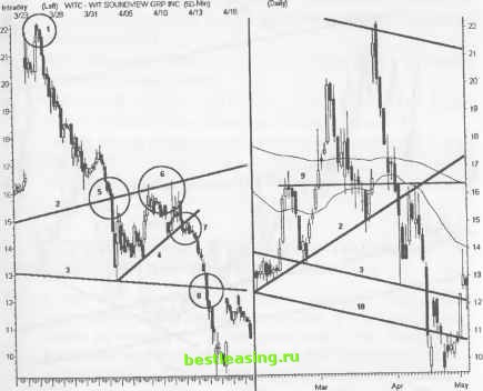Inltaday (Left) VICL - V1CAL INC (БО-Min) Bar 3/15 3/21 3/27 3/31 ME 4/12 4/18 Daily ![]() RealTick® ©1986-2000. Все права защищены. Используется с разрешения Townsend Analytics, Ltd. ДОХОДНОСТЬ/РИСК Опасность возникает между неудачным тестированием 50-дневного среднего скользящего ЕМА и последним уровнем минимума, находящемся на уровне поддержки зоны застоя на отметке 30. Простейшая стратегия, основанная на следовании за тенденцией, позволяет зафиксировать значительные прибыли, когда цена совершает колебательные движения в зоне, ограниченной 50-дневным и 200-дневным средними скользящими и при последующем ее нисходящем движении. Данный установочный набор имеет большой потенциал, благодаря толпе, скопившейся в зоне застоя. Вся толпа готова моментально покинуть судно при прорыве 200-дневного среднего скользящего. ШОРТ В КАНАЛЕ (CHANNEL SHORT) Данный установочный набор в большей степени приспособлен к осуществлению коротких продаж акций внутри параллельного ценового канала, чем к трейдингу на прорыве канала, завершающего построение некой формации. Параллельные ценовые каналы и связанные с ними гармонические линии четко определяют уровни поддержки/сопротивления, необходимые для идентификации точек входа в рынок с минимальным риском потерь. Всегда делайте ставку на канал, если хотите сохранить позиции неповрежденными до тех пор, пока ценовое движение не образует зону застоя, а ценовые бары не начнут сужаться вдоль одной из трендовых линий после предыдущего удара. Начертите более мелкие линии и ценовые каналы внутри более крупной модели для обнаружения точек схождения там, где должно произойти расширение ценовых баров. Два из трех наборов вложенных параллельных ценовых каналов часто бывают скрыты в пределах границ. ОПИСАНИЕ Параллельный ценовой канал формируется, по крайней мере, по двум точкам каждого экстремума. Гармонические линии ценового канала развиваются внутри более крупной модели. Нисходящие ценовые каналы предоставляют больше благоприятных возможностей для коротких позиций, чем восходящие каналы. Идентифицируйте трендовые линии и каналы в пределах параллельного ценового канала. Торгуйте на прорывах вниз элементов графика, построенного во временных рамках, меньших исследуемого. Если имеется такая возможность, открывайте первый трейд непосредственно на экстремальном уровне ценового канала. Затем последуют серии благоприятных условий для открытия очередных коротких позиций, по мере того как более мелкие модели будут идентифицировать цель соотношения доходность/риск. И когда цена в конечном счете достигнет противоположного экстремального уровня ценового канала, продолжайте следовать той же стратегии, если произойдет прорыв канала. РИСУНОК 13.5 ![]() Nov Dec Jan Feb Mar RealTick® ©1986-2000. Все права защищены. Используется с разрешения Townsend Analytics, Ltd. Осуществляйте короткую продажу на прорыве вниз гармонической линии (8) при развороте модели Голова и Плечи . Открывайте позицию непосредственно вблизи к точке прорыва или же оставайтесь вне рынка. Закрывайте позицию при расширении свечи при ее ударах об уровень минимума самого низкого ценового канала (10). ДОХОДНОСТЬ/РИСК Несколько благоприятных возможностей для трейдинга с минимальным риском потерь появляется при колебаниях цены в пределах ценового канала. Потенциальная прибыль таких позиций достигает 2-3 пунктов при максимальном р