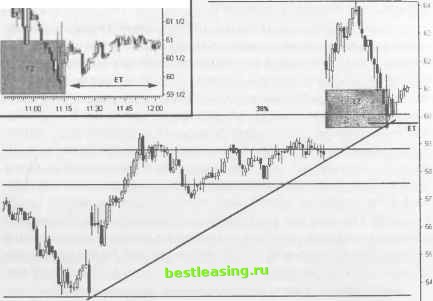 ГЛАВА ![]() ТОЧНОЕ ИСПОЛНЕНИЕ ТОРГОВОЙ СДЕЛКИ ВРЕМЯ И МЕТОДЫ Каким бы идеальным ни был установочный набор, плохое исполнение торговой сделки может обесценить его. Всегда ищите надежные благоприятные условия для трейдинга, при отсутствии же таковых лучше остаться вне рынка до появления следующих. Применяйте правильно подобранные стратегии и управляйте позициями, доводя их до прибыльного закрытия. ЦЕЛЬ ИСПОЛНЕНИЯ ТОРГОВОЙ СДЕЛКИ Цель исполнения торговой сделки (execution target - ЕТ) определяет, где осуществлять покупку или короткую продажу акции. Многообещающий установочный набор указывает на этот узкий диапазон цены, на базе детального анализа уровней поддержки/ сопротивления, модели застоя и оценки соотношения доходность/ риск. Свинг-трейдеры обязательно учитывают все внешние факторы, которые способны повлиять на рыночные условия до достижения этого важного показателя. Помните о том, что ЕТ достаточно динамично изменяется по мере того, как новые данные пополняют предыдущий анализ. Один единственный тик способен повлиять на расчет соотношения доходность/риск и заставить отказаться от мысли осуществить данный трейд. Зона осуществления торговой сделки (execution zone - EZ) расположена между краткосрочным ценовым движением и заранее выбранной целью исполнения трейда (ЕТ). Она определяет границы, на которые нужно обратить особое внимании при открытии будущей позиции. Как только цена начинает наносить удары по EZ, все внимание свинг-трейдеров приковывается к цели исполнения сделки. Исследуйте эту область, уделив этому исследованию достаточно времени для того, чтобы определить, какой установочный набор применить к данному исполнению сделки, когда цена достигнет цели. Только здравый смысл поможет идентифицировать искомую область EZ. Один из простейших методов идентификации EZ ориентируется на последнюю волатильность акции, определяется адекватным расстоянием до цели исполнения ЕТ. Другой метод берет за основу последний промежуточный уровень поддержки/сопротивления, который акция должна благополучно миновать перед достижением ЕТ и установить его там. Исследуйте краткосрочный ценовой график и особенно тщательно тот его участок, на котором цена проходит сквозь область EZ. Здесь проявляются все необходимые основные признаки, подтверждающие анализ установочного набора и будущей позиции. Все должно быть обоснованно, и все должно предварительно подтверждать надвигающийся разворот, прорыв или увядание ценового движения: и время, и тенденция, и настрой рыночной толпы. Зачастую взрыв активности толпы и тикер продаж предоставляют все необходимые подтверждения. Не следует забывать, что некоторые надежные сигналы работают при небольшом количестве участников рынка. Так, например, открытие позиции в сужающейся пустой зоне предлагает очень узкий диапазон области EZ и цель исполнения ЕТ с минимальным риском потерь. Когда цена начинает наносить удары по цели ЕТ, свинг-трейдер должен принять решение: входить в рынок или занять выжидательную позицию. Для принятия единственно верного решения необ- РИСУНОК 15.1 Акция Nextel откатывает после утреннего гэпа. Большой зазор цены уцелел в первый час торговой сессии, и шансы на успешное тестирование новых максимумов возросли. Трендовая линия проходит через уровень целого числа 60 и 38%-ый уровень коррекц