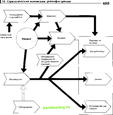 заказов. Показатели их деятельности зависят от одной и той же информации: насколько быстро покупатели Wal-Mart приобретают продукцию P&G. Другими словами, информация соединяет бизнес-процессы обеих компаний, позволяет отслеживать объем продаж и гарантировать, что покупатели Wal-Mart не отправятся в Kmart, чтобы купить там Tide, стиральный порошок, выпускаемый P&G. Но эта связь ключевых бизнес-процессов не означает, что две компании должны действовать одинаково, а только то, что они имеют общий источник - информацию, поддерживающую их бизнес-процессы и привязывающую их к потребителю. Явная выраженная общность и в том, что каждый участник этой пары знает, когда и что делать, если в Wal-Mart мало упаковок Tide. (И наоборот, во многих случаях стратегические цели Kmart устанавливаются как реакция на доминирование Wal-Mart в ключевых процессах. Поэтому Kmart приходится выбирать в качестве способа действий вариант догнать , как это делают многие компании с традиционными бизнес-моделями, пытающиеся дублировать цифровые подходы.) Успешным компаниям необходимо четко понимать, как меняется внешняя среда, в которой действует бизнес, и какие инновационные процессы происходят за пределами их отрасли, а не только в их виде бизнеса. Чтобы способствовать реализации стратегии, лидеры должны меньше думать о структурах и функциях и больше фокусироваться на процессах, контролирующих ценность, которую они планируют доставить своим потребителям. Питер Кин, автор нескольких книг об управлении знаниями, утверждает: Существует все меньше и меньше устойчивых преимуществ по продуктам, преимуществ защищенных рынков и национальных преимуществ. Это означает: есть все меньше и меньше способов создания и поддержания рыночной дифференциации. Не могу представить никакого другого способа, при помощи которого компания может выделиться теперь, если не говорить о процессе *. В 80-х годах Майкл Портер предложил концепцию цепочки ценности, позволяющую соединить исходные и конечные компоненты бизнеса. Однако сегодня цепь ценности может потребовать более искусного описания взаимодействия компаний и потребителей. Компания может выбрать вариант действий в любом месте в цепочке ценности (рис. 15.1), но мудрые стратеги выбирают ту часть (составляющую) в этой цепи, в которой их компания может добиться превосходных результатов. * См.: Keen. The Process Edge. P 163. ![]() Рис. 15.1. Сеть сетевой ценности. Как показано во многих примерах действий корпораций, обсуждаемых в этой главе, существует множество вариантов использования стратегических процессов в качестве рычагов воздействия на бизнес (табл. 15.1). Однако при любом варианте, чтобы оставаться динамичной, компании необходимо постоянно добиваться, чтобы их процессы обеспечивали выбранную стратегическую цель. В следующем параграфе описываются шесть шагов по обновлению и реконфигурации процессов. Реконфигурация ключевых бизнес-процессов Ниже перечислены шесть основных шагов, необходимых для обновления и реконфигурации ключевых бизнес-процессов: Таблица 15.1. Подходы к стратегическим процессам, выступающим рычагами воздействия на бизнес Подходы* Примеры интенсификация: улучшение процессов, предназначенных для более полного обслуживания имеющихся потребителей На этом направлении многие компании основные усилия уделяют реинжинирингу; внедрение ячеистог