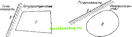 Доказательство завершено. Сами числа tu . . ., tp из (16:2:d) можно рассматривать и как компо- -> ненты вектора t = {tu . . ., tp} в Lp. Поэтому множество возможных значений вектора, которое определяется условиями 2 = 1, удобно как-то именовать. Мы будем обозначать его через Sp. Обозначим, далее, множество векторов t9 удовлетворяющих только первой группе1 ![]() ![]() Рис. 13. Рис. 14. tp 0, через Рр. Оба множе- предыдущих условий, т. е. О, ства Sp и Рр являются выпуклыми. Изобразим графически случаи р = 2 (плоскость) и р = 3 (пространство). Р2 есть положительный квадрант - множество точек между положительными полуосями xt и х2 (рис. 13). Р3 есть положительный октант - пространство, заключенное между положительными полуосями xi, х2 и х3, т. е. между плоскими квадрантами, ограниченными парами х1у х2; х х3; х2, х3 (рис. 14). S2 есть прямолинейный отрезок, пересекающий Р2 (рис. 13). S3 - плоский треугольник, аналогичным образом пересекающий Р3 (рис. 14). Полезно изобразить отдельно множества S2, S3 без Р2, Р3 (и тем более без L2, L3), в которые они естественно погружаются (рис. 15 и 16). На рисунках отмечены расстояния, пропорциональные xiy х2 и соответственно Xi, х2, х3. (Подчеркнем еще раз: расстояния, отмеченные на рис. 15 и 16 как хи х2, х3, не являются самими координатами х±, х2, х3. Последние лежат в L2 или в L3 вне S2 или S3 и поэтому не могут быть изображены на S2 или на S3. Однако, как можно легко показать, они пропорциональны этим координатам.) ![]() Рис. 16. 16.2.3. Другим важным понятием является понятие длины вектора. Длиной вектора х = {х . .,. х} называется Расстоянием между двумя точками (векторами) называется длина вэктора разности 1*- = У 2 (г-г/г)2 -7 г=1 Таким образом, длина вектора х есть его расстояние от начала коорди-нат 0 *). 16.3. Теорема об опорной гиперплоскости 16.3. Установим теперь одно важное общее свойство выпуклых множеств. -> -> - . {16:В) Пусть дано р векторов х\ . . ., хр. Тогда вектор у либо принадлежит выпуклому множеству С, натянутому на векторы х1, . . ., хр (см. (16:А:с) в п. 16.2.1), либо существует такая, -> содержащая г/, гиперплоскость (см. (16:2:а) в п. 16.2.1), что множество Ссодержится в одном из полупространств, порождаемых этой гиперплоскостью (скажем, (16:2:Ь) в п. 16.211; см. (16:А:Ь) там же). Это утверждение справедливо и втом случае, когда выпуклое множе- -V -> ство, натянутое на ж1, . . ., #р, заменено любым выпуклым множеством. ![]() Рис 17. Рис. 18. В такой форме это утверждение является основным рабочим аппаратом современной теории выпуклых множеств. Картина в случае п = 2 (т/е. для плоскости) оказывается следующей. На рис. 17 изображено выпуклое множество С с рис. 12 (которое натянуто на конечное число точек), тогда как на рис. 18 изображено выпуклое множество С общего вида 2). г) Евклидов и пифагоров смысл этих понятий очевиден. 2) Для читателя, знакомого с топологией, мы добавим следующее. Для того чтобы оставаться строгим, это предложение должно быть уточнено - утверждение верно для замкнутых выпуклых множеств. Это гарантирует существование минимума, которым мы пользуемся при доказательстве. Об этом см. также замечание на страницах 397, 398. Прежде чем доказывать (16:В), заметим, что вторая альтернатива явным образом исключает первую, поскольку у принадлежит гиперплоскости, а не полупространству (т. е. выполняется (16:2:а), а не (16:2:Ь) из (16:А:Ь)). Перейдем теперь к доказательству. Доказательство. Предположим, что у не принадлежит С. Возьмем тогда точку из С, которая лежит ближе всего к г/, 