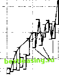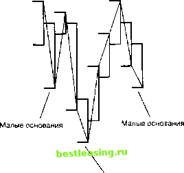 ПОСТРОЕНИЕ Для правильного построения графика малой тенденции необходимо следующее: график баров, данные о цене и времени, красная ручка, зеленая ручка, черная ручка и линейка. Черная ручка нужна для обновления графика, зеленая - для обозначения восходящего движения линии тренда, красная - для обозначения нисходящего движения линии тренда. Так как неуверенно нанесенная линия может быть неправильно истолкована, то для нанесения четких и точных линий применяется линейка. Данные о цене и времени используются для подтверждения точного обозначения максимума и минимума, так как расчеты, сделанные на глаз , могут привести к неправильным обозначениям, которые тоже крайне неблагоприятно могут повлиять на результаты анализа. График малой тенденции (рис. 4.4) лучше всего начинать с первого бара торгуемого контракта, потому что к тому времени, как дойдет очередь до анализа этого контракта, он начнет активно торговаться на рынке, а у аналитика к этому моменту будут построены уже все малые колебания, а также приобретена ценная информация о цене и времени, начиная с момента нанесения на график всей динамики. Этот график является отпечатками пальцев рынка, потому что каждый индивидуальный рынок имеет свои уникальные модели, содержащиеся в едином графике, с помощью которого можно идентифицировать рынок. Вот почему важно поддерживать точные данные. Рис. 4.4 Бары индикатора малой тенденции от минимальной цены. Второстепенные основания образованы колебаниями рынка наверх. От минимума линия малой тенденции движется к наивысшему максимуму. ![]() Малые основания Малая тенденция и месячный график от минимальной цены На месячном графике начинайте построение индикатора с первого месяца торговли. Затем каждый месяц просто следуйте движению рынка. Если от минимальной цены рынок образовал движение к вершине, создав максимум, используйте зеленую ручку для проведения линии малой тенденции, простирающейся вверх от минимума, находящегося на один бар назад, до максимума текущего бара. В этом случае минимум, что находится одним баром назад, становится малым основанием, или - второстепенным низом. Каждый месяц, когда рынок образует последующую вершину - максимум, ведите линию малой тенденции вверх, к достигнутой им максимальной цене. Продолжайте вести линию малой тенденции от максимума к максимуму, пока рынок не образует локальный наименьший минимум. В этом случае используйте красную ручку для нанесения линии малой тенденции вниз от одного бара, который находится позади максимума, к минимуму текущего бара. Тогда максимум, что размещен на один бар назад, становится малой вершиной. Каждый месяц, когда рынок образует последующий наименьший минимум, продолжайте вести линию малой тенденции вниз, к вновь достигнутой минимальной цене. Продолжайте вести линию малой тенденции от минимума к минимуму до тех пор, пока рынок не образует локальную наибольшую вершину. Малая тенденция и месячный график от максимальной цены На месячном графике (рис. 4.5) начинайте строить индикатор с первого месяца торговли, затем каждый месяц просто следуйте движению рынка. Если от максимальной цены рынок образовал наименьший минимум, используйте красную ручку для проведения линии малой тенденции вниз от вершины того бара, который находится позади на один бар, до минимума текущег