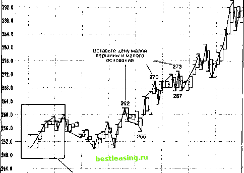 320.0 316.0 312.0 308.0 3M.D 300.0 246.0 ![]() Начинайте индикатор ; малой тенденции с первого торгового бара 236.0 ........... 232.0 228.0 ............. 224.0 то-1-1-1-1-;-1-1--1 12/29/94 2/24/95 4/21/95 6/16/95 8/11/95 10/6795 12/1/95 1/26/96 3/22/96 Рис. 4,6 Недельный график индикатора малой тенденции от минимальной цены. ка. Если, оттолкнувшись от минимальной цены, рынок образовал локальный наибольший максимум, то используйте зеленую ручку для проведения линии малой тенденции вверх от минимума, который был зафиксирован одним баром раньше, до максимума текущего бара. Тогда минимум, что был один бар назад, становится малым основанием. Каждую неделю, когда рынок образует последующий наибольший максимум, продолжайте вести линию малой тенденции наверх, к достигнутой рынком максимальной цене. Продолжайте вести линию малой тенденции от максимума к максимуму, пока рынок не образует локальный наименьший минимум. В этом случае используйте красную ручку для нанесения линии малой тенденции вниз, ведя ее от одного бара позади максимума, к минимуму текущего бара. Тогда максимум, который находится на предыдущем баре, становится малой вершиной. Каждую неделю, когда рынок образует последующий наименьший минимум, продолжайте вести линию малой тенденции вниз, к достигнутой рынком минимальной цене. Продолжайте вести линию малой тенденции от минимума к минимуму до тех пор, пока рынок не образу етнаивысший максимум. Малая тенденция и недельный график от максимальной цены На недельном графике начинайте строить индикатор с первой недели торговли. Затем каждую неделю просто следуйте движению рынка. Если после достижения максимальной цены рынок образовал локальный наименьший минимум, то используйте красную ручку для нанесения линии малой тенденции, ведя ее вниз от максимума, что находится один бар назад, до минимума текущего бара. Тогда этот максимум, что находится одним баром раньше, становится малой вершиной. Каждую неделю, когда рынок образует последующий наименьший минимум, продолжайте вести линию малой тенденции вниз, к достигнутой минимальной цене. Продолжайте вести линию малой тенденции от минимума к минимуму до тех пор, пока рынок не образует наибольший максимум. В этом случае используйте зеленую ручку для нанесения линии малой тенденции вверх, начиная от минимума того бара, что на один позади, к максимуму текущего бара. Тогда минимум, который находится одним баром назад, становится малым основанием. Каждую неделю, когда рынок образует последующий наибольший максимум, продолжайте вести линию малой тенденции вверх к достигнутой максимальной цене. Продолжайте вести линию малой тенденции от максимума к максимуму до тех пор, пока рынок не образует локальный наименьший минимум. Малая тенденция и дневной график от минимальной цены Принимаясь за дневной график, начинайте строить индикатор от первого дня торговли, а затем каждый день просто следуйте движению рынка. Если от минимальной цены рынок образовал локальный наибольший максимум, используйте зеленую ручку для проведения линии малой тенденции вверх, с минимума предыдущего бара до максимума текущего бара. Тогда минимум предыдущего бара становится малым основанием. Каждый день, когда рынок образует последующий наибольший максимум, продолжайте вести линию малой тенденции наверх к достигнутой максимальной цене. Ведите линию малой тенденции от максимума к