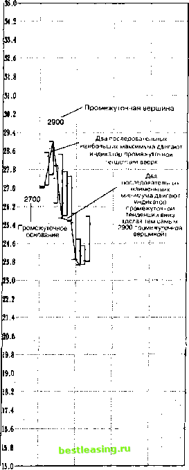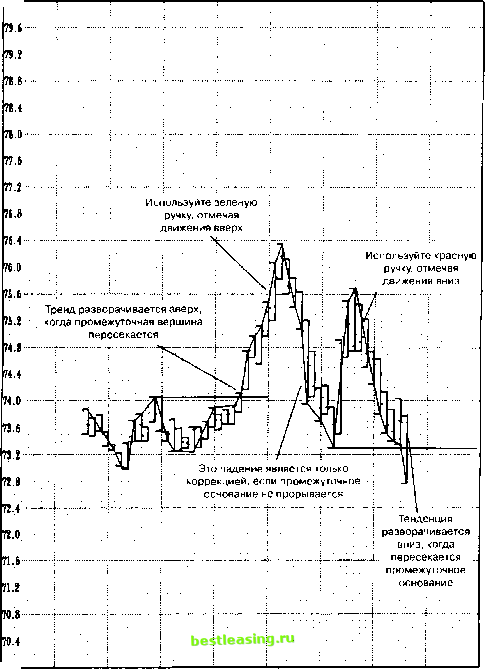 ![]() 2/29/96 10/31/96 6730/97 2/28/98 10/31/98 Рис. 5.3 График промежуточной тенденции, показывающий промежуточную вершину и основание. Лучше всего начинать график промежуточной тенденции (рис. 5.4) с первого бара, когда открылась торговля по контракту. Тогда к тому времени, как дело дойдет до анализа контракта, а рынок будет активно торговаться, у вас будут уже построены все промежуточные колебания по этому контракту и налицо ценная информация о цене и времени, так как вся динамика будет нанесена на график, начиная с самого первого момента. Такой график является как бы отпечатками пальцев рынка, потому что выявляет особенные, уникальные модели, присущие каждому рынку, с помощью которых его можно идентифицировать и более точно охарактеризовать. Вот почему необходимо всегда поддерживать точные данные о рыночных движениях. Промежуточная тенденция и месячный график от минимальной цены Работая с месячным графиком, начинайте строить индикатор с первого месяца торговли, а затем каждый месяц просто следуйте движению рынка. Если от минимальной цены рынок образовал два последовательных наибольших максимума, используйте зеленую ручку для проведения линии промежуточной тенденции вверх, от основания того бара, который находится на два бара позади, до максимума текущего бара. Тогда минимум двумя барами раньше становится промежуточным основанием. После того, как двух-баровый индикатор обозначил движение наверх, дальше уже необязательно иметь два последовательных наибольших максимума, чтобы вести линию промежуточной тенденции вверх. Каждый месяц, когда рынок образует последующую наибольшую вершину, продолжайте вести линию промежуточной тенденции наверх, к достигнутой максимальной цене. Продолжайте вести линию промежуточной тенденции от максимума к максимуму, пока рынок не образует два последовательных наименьших минимума. В этом случае используйте красную ручку для нанесения линии промежуточной тенденции вниз от максимума двумя барами позади к минимуму текущего бара. Тогда максимум на два бара сзади становится промежуточной вершиной. После того, как двух-баровый индикатор определил движение вниз, дальше уже необязательно иметь два последовательных наименьших минимума, чтобы вести линию промежуточнойтенденции вниз. Каждый месяц, когда рынок образует последующий наименьший минимум, просто ведите линию промежуточной тенденции вниз, к этой вновь достигнутой минимальной цене. Продолжайте вести линию промежуточной тенденции от минимума к минимуму, пока рынок не образует два послед овательныхнаиболыпихмаксимума. Промежуточная тенденция и месячный график от максимальной цены На месячном графике начинайте строить индикатор с первого месяца торговли, а затем каждый месяц просто следуйте движению рынка. Если от максимальной цены рынок образовал два последовательных наимень- 80.0 ![]() 4/12/96 6/7/96 8/2/96 9/27/96 11/22/96 1/17/97 3/14/97 5/9/97 7/4/97 Рис. 5.4 Пример графика промежуточной тенденции за 1997 год на недельном канадском долларе. 1 2 3 4 5 6 7 8 9 10 11 12 13 14 15 16 17 18 19 20 21 22 23 [ 24 ] 25 26 27 28 29 30 31 32 33 34 35 36 37 38 39 40 41 42 43 44 45 46 47 48 49 50 51 52 53 54 55 56 57 58 59 60 61 62 63 64 65 66 67 68 69 70 71 72 73 74 75 76 77 78 79 80 81 82 83 84 85 86 87 88 89 90 91 92 93 94 95 96 97 98 99 100 |