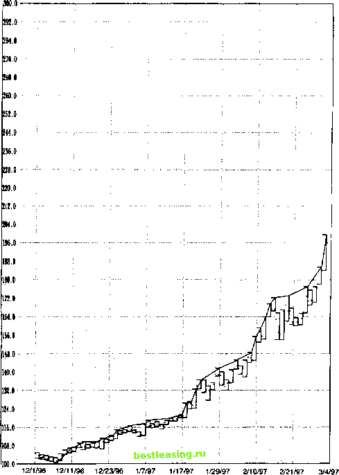 Основная тенденция и дневной график от минимальной цены Обращаясь к дневному графику, начинайте строить индикатор с первого дня торговли, а затем каждый день просто следуйте движению рынка. Если от минимальной цены рынок образовал три последовательно идущих друг за другом наибольших максимума, то используйте зеленую ручку для проведения линии основной тенденции вверх от минимума, который зафиксировался тремя барами ранее, нанося ее до максимума текущего бара. Тогда минимум, что три бара тому назад, становится главным основанием. После того, как трех-баровый индикатор определился в своем движении наверх, дальше уже необязательно иметь три последовательно идущих наибольших максимума, чтобы продолжать вести линию основной тенденции наверх. Каждый день, когда рынок образует последующую наибольшую вершину, продолжайте вести линию основной тенденции наверх, к вновь достигнутой максимальной цене. Продолжайте прокладывать линию основной тенденции от максимума к максимуму, пока рынок не образует три последовательно возникших наименьших минимума. В этом случае используйте красную ручку для нанесения линии основной тенденции вниз от максимума, который возник три бара тому назад, ведя ее к минимуму текущего бара. Тогда максимум, расположенный три бара назад, становится основной вершиной. После того, как трехбаровый индикатор определился в движении вниз дальше уже не обязательно иметь три последовательных наименьших минимума, чтобы продолжать вести линию основной тенденции вниз. Каждый день, когда рынок образует последующий наименьший минимум, продолжайте вести линию основной тенденции вниз, к новой минимальной цене. Продолжайте прокладывать линию основной тенденции от минимума к минимуму, пока рынок не образует три последовательно идущих друг за другом наибольших максимума. Основная тенденция и дневной график от максимальной цены На дневном графике начинайте строить индикатор с самого первого дня торговли, а затем каждый день нужно просто следовать движению рынка. Если от максимальной цены рынок образовал три последовательно идущих друг за другом наименьших минимума, то используйте красную ручку для проведения линии основной тенденции вниз от максимума, который возник три бара тому назад, до минимума текущего бара. Тогда максимум, что на три бара позади, становится основной вершиной. После того, как трех-баровый индикатор вызвал движение вниз, дальше уже необязательно иметь три последовательно идущих наименьших минимума, чтобы продолжать вести линию основной тенденции вниз. Каждый день, когда рынок образует последовательно понижающиеся цены - наименьшие минимумы, ведите линию основной тенденции вниз, к вновь достигнутой минимальной цене. Продолжайте вести линию основной тенденции от минимума к минимуму, пока рынок не образует три последовательных, идущих друг за другом, наибольших максимума. В этом случае используйте зеленую ручку для нанесения линии основной тенденции вверх от минимума, ![]() Рис. 6.5 Дневной график индикатора основной тенденции от минимальной цены, отражающий важность трехдневного графика индикатора основной тенденции. Заметьте, что этот график не показывает трехдневную коррекцию за трехмесячный период. Также обратите внимание на то, что торговые диапазоны возле минимумов более узкие, а 