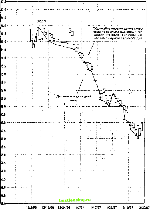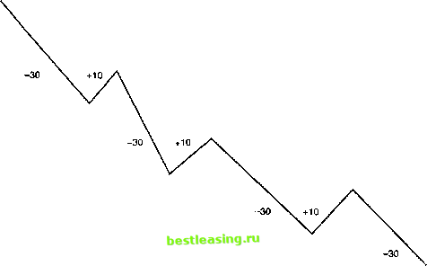 ![]() Рис. 7.13 График длительного спада. Исключение из правил стопа индикатора тенденции. Стоп, когда он так устанавливается, не меняет тенденцию, а используется для фиксирования прибыли. щими вверх. При движении же вниз, соответственно, перемещать ли стоп над максимумом, либо двигать его над вершинами колебаний, вслед за тремя или пятью колебаниями, развивающимися в нижнюю часть рынка. УРАВНОВЕШИВАЮЩИЕ КОЛЕБАНИЯ Существует еще одно исключение из правил, связанное с размещением стопа. Это - график уравновешивающих колебаний, который включает в себя расчет движений предыдущих колебаний (рис. 7.14). К примеру, если последнее колебание было 9 центов вверх и 4 цента вниз, тогда, вслед за следующим 9-центовым подъемом, стоп следует переместить вверх от позиции, находящейся ниже основания последнего колебания, на позицию, что как раз под 4-центовой коррекцией последней максимальной цены. Такой тип перетаскивания стопа потребует от трейдера постоянного наблюдения за тем, как рынок образует новые максимумы. Это необходимо, чтобы постоянно перемещать стоп на правильную позицию. Такая остановка рассчитана на активизацию после подъемов, эквивалентных или превышающих предыдущий подъем. Аналогичные действия осуществляются и в отношении падения, которое больше, чем предыдущие спады. Ситуация со стопами на продажу прямо противоположна. Например, если последнее колебание было 50 пунктов вниз и 20 наверх, тогда вслед за спадом на 50 пунктов, стоп нужно переместить вниз, с позиции над вершиной последнего колебания на позицию, что как раз над 20 пунктами коррекции последней минимальной цены. Перевес цены и времени Полагаясь на графики колебаний, трейдеру необходимо рассчитать величину и продолжительность колебаний. Явно, что при нисходящем рынке спад имеет тенденцию более длительного развития, нежели подъем, который бывает короче, особенно если рассматривать ситуацию с точки зрения цены и времени. Когда рынок находится ближе к своему основанию, частота его колебаний обычно начинает расти. То же самое происходит с продолжительностью подъемов с точки зрения как цены, так и времени. За этими действиями нужно наблюдать и считать их путеводной нитью рынка к основанию. Особенно за ними нужно внимательно наблюдать, когда рынок достиг уровня исторически минимальной цены. Часто первый сигнал о достижении основания выглядит как расширение дневного диапазона в верхнюю часть рынка. Это движение может появиться на первый, второй или третий день, после того, как цены достигли своего дна. Даже ранее того, как рынок пересечет вершину колебания в основании, он покажет все признаки дна. Трейдеры должны отметить это первое движение колебания вверх от основания. Эта ситуация часто повторяется, причем из года в год, и может служить характеристикой определенного рынка - у каждого рынка она обладает своими собственными ![]() Рис. 7.14 График полностью уравновешенного колебания. особенностями. Записи этих характеристик необходимы, так как очень часто они являются ключом к определению величины и продолжительности предстоящего подъема. Такой тип движения часто проявляется на сезонной основе, либо иным циклическим образом. Вот почему исторические даты оснований должны быть всегда под рукой. Чем более продолжительным является первый подъем от основания с точки зрения це