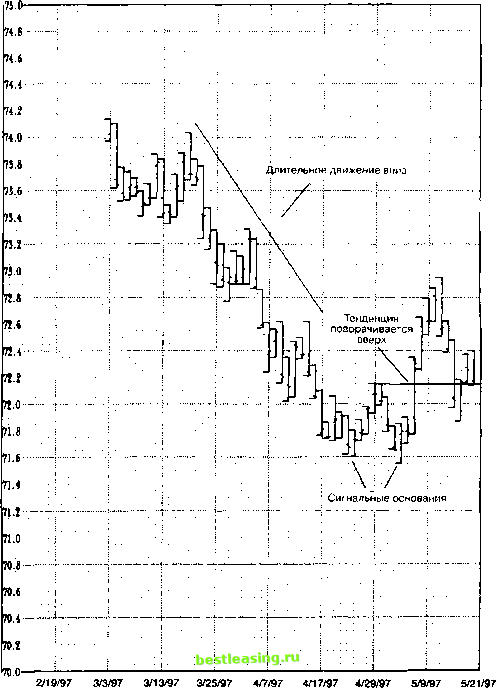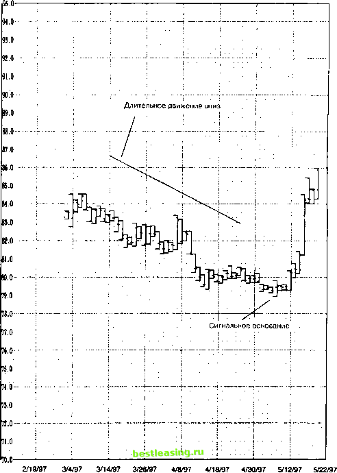 ![]() Рис. 7.23 График сигнального основания, показывающий компенсационные сигнальные основания, которые являются существенным признаком того, что тенденция готовится к развороту наверх. ![]() Рис. 7.24 График сигнального основания, показывающий, что расширенный диапазон внешнего сигнального основания часто ведет к сильному подъему. крытия. Если все это происходит в действительности, значит рынок образовал основание и тенденция готовится развернуться вверх. Сигнальное основание является одним из самых мощных индикаторов образования главного основания. Обычно оно возникает на исторических основаниях или рядом с ними и часто становится минимумом, который достигается торгуемым контрактом. Вот почему очень важно отражать эти основания на графике и рассматривать в ряду всех исторических оснований товарного рынка. Как уже было сказано, все это выполняется при использовании годового, квартального, месячного и недельного графиков с переходящими друг в друга контрактами с одним и тем же месяцем. В большинстве случаев, эти графики начинают активно работать после того, как рынок пережил сильный вертикальный спад и торговля находится в зоне, которая еще не идентифицирована как поддержка на текущем активном графике. Другими словами, такой тип основания чаще всего возникает вслед за прорывом, который выходит вниз ниже минимума старого контракта и образует минимум для нового контракта. Самого по себе наличия этого сигнала обычно недостаточно для инициации покупок, потому что при этом не обязательно возникает действительный подъем и нисходящая тенденция опять возобновляется. Вырывающийся наверх подъем необходим, так как подтверждает образование сигнального основания. Сигнальное основание часто называют еще основанием разворота цены закрытия или основанием ключевого разворота, но эти термины не так определенны. Это верно также и в отношении ссылок на закрытие выше средней точки дня, закрытие выше открытия либо резкого всплеска наверх. Или же длительного движения вниз в цене и по времени. Для того, чтобы понять значимость сигнального основания, нам необходимо разбить его на компоненты. Длительное движение в цене - важная часть в определении значимости сигнального основания. Этот тип сигнала должен появляться после сильного ценового спада. Как уже говорилось, необходимо вести записи величины спадов в отношении цены, потому что рынок их часто повторяет. Изучайте прошлые данные для того, чтобы увидеть, равноценен или превышает текущий спад предыдущий в момент появления сигнального основания. Знание исторических данных серьезно помогает предвидеть появление сигнального основания дня. Помимо изучения величины ценовых колебаний, трейдеру следует знать, достиг ли рынок действительно исторически низких ценовых уровней. Длительное движение во времени также является важным признаком предстоящего появления дневного сигнального основания дня. Как уже говорилось, время играет важнейшую роль в определении изменения тенденции или формирования основания. Таким образом, история рыночных временных спадов, а именно - исторические данные графика колебаний, такие как протяженность от оснований до вершин и от оснований до оснований, является важной информацией для определения времени и места появления истинного сигнального основания.