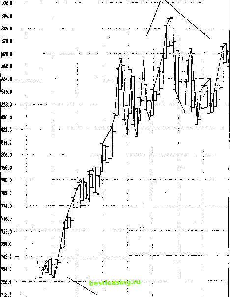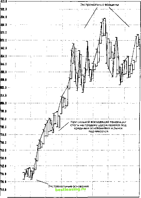 ОСНОВНЫЕ ИНСТРУКЦИИ ПО ТОРГОВЛЕ Точки покупки и продажи После построения графиков индикатора тенденции, изучения вершин и оснований колебаний, а также принципов размещения стопа довольно просто начинать торговлю, используя этот, уже подготовленный, торговый арсенал. Ниже даются общие рекомендации, как использовать индикатор тенденции при входе в рынок. Использование индикатора тенденции только лишь при входе в рынок позволяет трейдеру ориентироваться на рынке, следя за изменениями в тенденции (рис. 8.4 и 8.5). После правильного построения графиков индикаторов тенденции определите текущее положение рынка относительно его исторических ценовых уровней или диапазона, в котором движется активный в настоящее время контракт. Это важно, потому что индикатор тенденции как инструмент анализа работает лучше, когда рынок находится на историческом максимуме или минимуме, либо следует за продолжительно развивающимся движением вверх или вниз. Построение индикатора тенденции может быть начато от любой точки графика, но на определенных уровнях он будет проявлять себя намного удачней, чем на других. Построение индикатора тенденции от экстремального уровня может дать лучший результат, чем в том случае, когда он стартует от середины основной кампании. Ниже даются пояснения относительно начала торгов, основанных на индикаторе тенденции, от четырех распространенных и достаточно легко идентифицируемых ценовых уровней. Инициирование сигнала индикатора тенденции к покупке на экстремальном минимуме. В ситуации вялого, движущегося в горизонтальном тренде рынка, который возник вслед за длительным движением вниз с точки зрения цены и времени, а также, когда рынок находится на экстремально низком ценовом уровне (рис. 8.6-8.8), размещайте стоп на покупку одного контракта над вершиной последнего колебания. После этого просто ждите, пока рынок не достигнет защитной остановки и не заполнит ордер. Затем размещайте стоп-ордер на продажу чуть ниже основания последнего колебания. Если рынок продолжает подниматься вверх, оставайтесь в этой позиции до тех пор, пока он продолжает образовывать все новые наибольшие максимумы и повышающиеся минимумы. Защитная остановка на продажу должна помещаться под основание последнего колебания. В продолжение развития этого подъема рынок может образовать ряд последовательно идущих друг за другом локальных максимумов, что может позволить ему достичь самых высоких вершин. В это время продолжайте следовать вверх за рынком, перемещая стоп на продажу каждый раз под основание нового колебания, фиксируя при этом прибыль. Как только рынок образует новую вершину колебания, а также прорвет осно- 9Ю.0 -,-.-:-:- ! Экстремальная вершина ![]() \ . \ Экстремальное основание ; j 710. (I --1- 1 -~л~-:---!-- 2/6/97 2/19/97 3/3/97 3/13/97 3/25/97 4/7/97 4/17/97 4/29/97 Рис. 8.4 Индикатор малой тенденции и точки покупки. Сильная покупка рядом с максимумом контракта не рекомендуется, так как возрастает частота торговли с двойными убытками, напротив,рекомендуется покупка на экстремальном основании во время пересечения рынком малых вершин, обозначенных 1,2.3 и 4. ![]() 2/6/97 2/19/97 3/3/97 3/13/97 3/25/97 4/7/97 4/17/97 4/2947 Рис. 8.5 Индикатор малой тенденции и точки продажи. На этом графике могут быть двойные убытки. Возле вершины частота малых оснований и точек продажи возрастает. 1 2 3 4 5 6 7 8 9 10 11 12 13 14 15 16 17 18 19 20 21 22