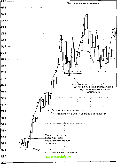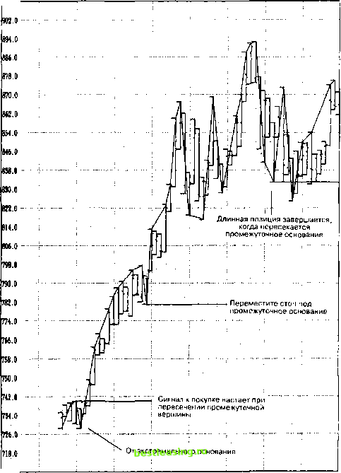вание последнего колебания, позиция будет закрыта, а трейдер окажется в пассивном состоянии. Инициирование сигнала индикатора тенденции к продаже на экстремальном максимуме. В ситуации вялого рынка, когда он движется в горизонтальном (боковом) направлении после длительного движения вверх с точки зрения цены и времени, а также, когда рынок находится на экстремально высоком ценовом уровне (рис. 8.9 - 8.11), размещайте стоп на продажу одного контракта непосредственно под основанием последнего колебания. Затем просто ждите, пока рынок не достигнет этого стопа и не заполнит его. После чего, поставьте защитный ордер на покупку непосредственно над вершиной последнего колебания. Если рынок продолжает опускаться ниже, оставайтесь в этой позиции до тех пор, пока он продолжает образовывать все новые понижающиеся минимумы и понижающиеся максимумы, постоянно сохраняя свой стоп на покупку над вершиной последнего колебания. В продолжение развития всего этого спада цен рынок может образовать серию самых низких оснований. В это время продолжайте следовать вниз за рынком, размещая защитную остановку на покупку каждый раз над вершиной нового колебания, чтобы использовать ее для фиксирования прибыли в случае резкого и неожиданного разворота. Как только рынок достигнет истинного основания и в результате резкого движения наверх прорвет последнюю главную вершину, позиция будет закрыта с помощью стопа, а трейдер окажется с пассивным торговым счетом. Разворотный стоп (Стоп и разворот) Инициирование сигнала к покупке с помощью разворотного стопа, или Стоп и разворот. Как уже было сказано, входить в покупку безопаснее всего либо после длительного движения вниз с точки зрения цены и времени, либо, когда рынок достиг экстремально низкого ценового уровня. Так как очень часто такое поведение бывает успешной моделью для торговли, то наиболее активные трейдеры могут выбрать время для покупки непосредственно вслед за выходом из короткой позиции. После достижения ценами стоп-ордера, предназначенного как для покупки с целью закрытия позиции, так и начала новой торговли, то есть - разворота, трейдер просто следует за восходящими колебаниями рынка. При этом он постоянно перемещает свои стопы на продажу, которые работают одновременно также как и стоп и разворот вверх каждый раз, когда образовывается новое промежуточное основание в колебательных движениях. Он сохраняет ту же длинную позицию, пока рынок продолжает образовывать все новые восходящие вершины и повышающиеся основания. Торговля ликвидируется, а позиция разворачивается вниз, когда основание последнего колебания пересекается, и тем самым, рынком достигается стоп на продажу. ![]() Рис. 8.6 минимума. 2/6ЛЭ7 2/19/97 З/Э/97 3/13/97 3/25/97 4/7/97 4/17/97 4/29/97 Индикатор малой тенденции и сигнал к покупке от экстремального 910.0 ![]() 2/6/97 2/19/97 3/3/97 3/13/97 3/25/97 4/7/97 4/17/97 4/29/97 Рис. 8.7 Индикатор промежуточной тенденции и сигнал к покупке от экстремального основания. 1 2 3 4 5 6 7 8 9 10 11 12 13 14 15 16 17 18 19 20 21 22 23 24 25 26 27 28 29 30 31 32 33 34 35 36 37 38 39 40 41 42 43 44 45 46 47 48 49 50 [ 51 ] 52 53 54 55 56 57 58 59 60 61 62 63 64 65 66 67 68 69 70 71 72 73 74 75 76 77 78 79 80 81 82 83 84 85 86 87 88 89 90 91 92 93 94 95 96 97 98 99 100 |