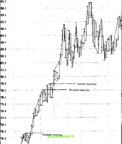 случае трейдерам следует использовать долгосрочные графики для планирования пирамиды. Месячные и недельные графики обычно лучше всех указывают на тот рынок, который подходит для пирамиды. Эти графики дают трейдеру возможность видеть, какие рынки торгуются на экстремальных уровнях, что с наибольшей вероятностью и соответствует эффективной долгосрочной пирамиде. Как уже было сказано, пирамидная торговля сегодня часто проигрывает из-за того, что трейдер не предоставляет тенденции достаточно времени для развития. Если вы торгуете близлежащим контрактом, то пирамида чаще всего провалится, потому что прокрутка (переход на другой месяц) произойдет слишком рано. На примере торговли соевых бобов пирамида ноябрьских соевых бобов, начавшаяся в октябре, прервана прокруткой к январским соевым бобам. Процесс перехода от одного контракта к другому зачастую сбивает трейдера с толку, особенно если это процесс перетекания трейдеров от контракта, торгуемого на старый урожай, к контракту на новый урожай. Такая, постоянно происходящая, прокрутка может вынудить аналитика больше сосредоточиваться на этом перетекании с одного контракта на другой, нежели на фактической торговле. Короче говоря, если вы хотите добиться успеха в образовании пирамиды, использующей долгосрочные тенденции рынка, то вы должны торговать отсроченными контрактами, не исключая возможности краткосрочной и относительно небольшой отдачи на инвестированный капитал, ввиду низкой ликвидности, а также аккуратно исследовать и серьезно планировать свою торговую стратегию. ПИРАМИДА ПОКУПКИ При долгосрочной пирамидной схеме ознакомьтесь с исторически низким уровнем данного рынка. Волатильность на этих экстремальных уровнях зачастую бывает очень низкой, особенно, если рынок завершает длительное движение вниз. В условиях низкой волатильности и узкого торгового диапазона можно без труда контролировать размещение и передвижение ордеров, ограничивающих убытки. Построение пирамиды с индикатором малой тенденции Существует два различных способа выстраивать пирамиду при торговле, использующей индикатор малой тенденции: 1. Покупка после пересечения вершины малой тенденции. 2. Покупка через фиксированные интервалы времени в направлении малой тенденции. Пирамидная покупка с использованием только малых колебаний. Высокая в конечном построении, пирамида может начаться с просто- го пресечения вершины малой тенденции после длительного движения вниз с точки зрения цены и времени. Конечно, высокая пирамида не образуется только по случайному стечению обстоятельств. Она должная быть заранее запланирована. После инициации первой сделки, обеспечивающей начало пирамиды, трейдер просто идет вслед за колебаниями рынка, добавляя позиции по мере того, как рынок продолжает двигаться вверх и пересекать малые вершины (рис. 8.12). Этот метод вовлекает покупательную силу, поэтому трейдер должен помнить, что могут возникнуть обычные колебания рынка вниз после того, как имели место сигналы к покупке. Это корректировочное движение может превратить прибыльную позицию в позицию с нулевой прибылью или даже в убыточную, что является следствием покупки по достаточно высокой цене - на вершине колебания. Пирамидная покупка на фиксированных ценовых уровнях с использованием индикаторов малой 