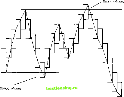 тенденции. Еще один вариант этого приема - размещать все стопы над вершиной основной тенденции. Это стиль торговли решительного трейдера. Она должна начинаться на экстремально высоком или исторически высоком ценовом уровне. Этот способ торговли напоминает перевернутую пирамиду из-за ширины на вершине и сжатости в основании, потому что у трейдера есть альтернатива ликвидации позиций по мере движения рынка вниз. Пирамидная продажа, использующая комбинацию индикатора промежуточной тенденции и индикатора основной тенденции. Четвертый способ войти в рынок - это создать позицию в тот момент, когда рынок пересекает основание последнего основного колебания. Дополнительные шорты добавляются к короткой позиции, для чего используется график промежуточного или двухдневного колебания. Вовлекаются все сделки, генерируемые графиком промежуточного колебания, которые совпадают с направлением основной тенденции. Защитные остановки размещены над основными вершинами для шортов основной тенденции и над промежуточными вершинами для короткой позиции промежуточной тенденции. Еще один вариант этого приема - размещать стопы только над главной вершиной. Это стиль торговли решительного трейдера. Она должен начинаться на экстремально высоком или исторически высоком ценовом уровне. Этот способ торговли напоминает перевернутую пирамиду из-за ширины на вершине и сжатости в основании, поскольку у трейдера есть альтернатива ликвидации позиций по мере продвижения рынка вниз. Перевернутая пирамида продаж В зависимости от того, насколько решителен трейдер и насколько он уверен в своем анализе рынка при определении истинно экстремального уровня, он может начинать свою позицию с так называемой перевернутой пирамиды . Правильная пирамида начинается благодаря длинному сигналу к покупке и характеризуется большим объемом позиции возле основания и меньшим объемом возле вершины. Перевернутая же пирамида начинается благодаря короткому сигналу и характеризуется большой позицией возле вершины и меньшей позицией возле основания. Трейдеры, применяющие этот метод, должны уметь квалифицированно рассчитать поддержку, чтобы успешно ликвидировать позиции на соответствующих ценовых уровнях. Эти точки поддержки могут являться различными комбинациями бывших промежуточных оснований, особенно если спад начался после резкого подъема. Дополнительными и выгодными точками поддержки могут являться точки процентной коррекции и углы Ганна от предыдущих оснований, если таковые определяются. Такие дополнительные точки поддержки будут рассматриваться в следующих главах. ОТРИЦАТЕЛЬНЫЕ СВОЙСТВА ГРАФИКА КОЛЕБАНИЙ Пилящий рынок Самый большой отрицательный фактор, который влияет на трейдера и генерируется от графика колебаний, это - пилящий рынок. Так называемая лила - это серия ложных изменений в тенденции, характеризуемая подъемами и спадами, которые не развиваются потом вверх или вниз, а изменяют направление после одного или двух баров, следующих за последним изменением в тенденции. Для того, чтобы предотвратить их появление, необходимо установить фильтры. Таким фильтром может быть просто увеличение величины защитных остановок, размещаемых над вершиной и под основанием. Для этого требуется, чтобы рынок сделал минимальное ценовое движение перед те