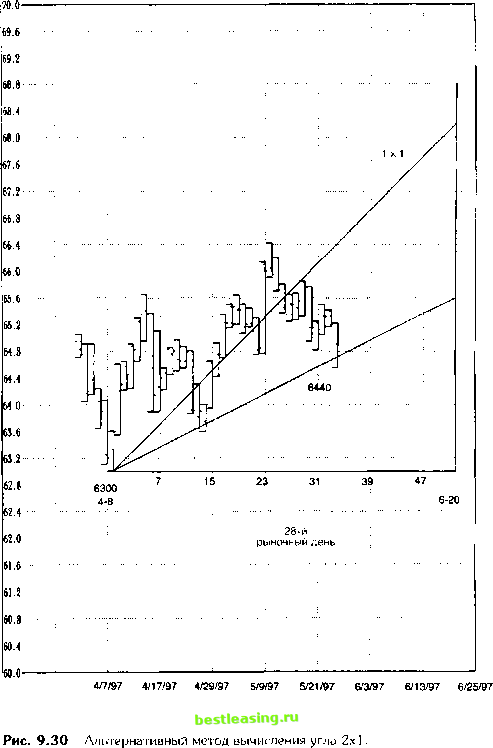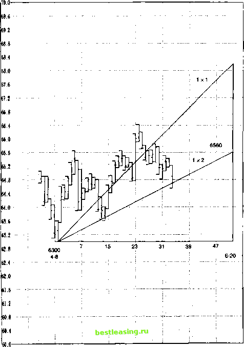 ![]() 4/7/97 4/17/97 4/29/97 5/9/97 5/21/97 6/3/97 6/13/97 6/25/97 Рис. 9.29 Вычисление углов Ганна от промежуточного основания: 1x2. ление то же самое, как и для угла 1x1). Помножьте 150 на 2, так как вы ищите угол, двигающийся в два раза быстрее, чем угол 1x1. Получается цифра в 300 пунктов. Прибавьте эту цифру к промежуточному основанию. В данном случае, 6300 плюс 300 пунктов помещает Ганна угол 2x1 на 6600. Возьмите красную ручку и постройте угол 2x1 от основания 6300 к 6600. Каждый день этот угол расположен на некоторой точно определенной точке графика. К примеру, 9 мая 1997 г. является 23 рыночным днем от промежуточного основания 6300. Угол 2x1 от основания 6300 на 9 мая 1997 г. будет на 6600 (рис. 9.27). Альтернативный метод вычисления угла 2x1, или определения цены Если промежуточное основание и шкала являются известными величинами, то можно установить дату, когда рынок будет, вероятней всего, торговаться по определенной цене. Используя рынок июньского рогатого скота, мы знаем, что основанием является 6300. Вопрос: Когда рынок, вероятней всего, будет торговаться на 6582, основываясь на текущей шкале и используя угол 2x1? (рис. 9.25). На этот вопрос очень легко ответить. Просто вычтите промежуточное основание из целевой цены и разделите результат на величину шкалы. Это число разделите на два, чтобы получить угол 2x1. Вы получите рыночный день, когда угол 2x1 пересечет эту цену. Найдите на графике его дату (рис. 9.28). Совсем не обязательно, что рынок будет торговать именно в этот день и по этой цене. Это только означает, что, если рынок следует за углом 2x1, то его минимум будет на этой цене. Решение 6582 - 6300 = 282 282:10 пунктов = 28.2 28.2:2 = 14.1 Ответ: 14.1 рыночных дней, что соответствует 28 апреля 1997 г. Углы Ганна от промежуточного основания Сильный рынок на бычьей стороне угла 1x1 Третий важный угол: 1x2 Третий угол, который нужно построить, - это угол 1x2, состоящий из одной единицы цены к двум единицам времени. Шаг 1: Поместив угол 1x1 на графике, добавьте угол 1x2. Шаг 2: От промежуточного основания стройте угол 1x2. Основная формула: шкала, умноженная на время, плюс основание. Пример: Рынок июньского рогатого скота, дневной график, 1997 г. Шкала составляет 10 пунктов в день. Промежуточное основание 6300 на 8 апреля 1997 г. От промежуточного основания 6300 на 8 апреля 1997 г. красной ручкой стройте линию вправо. Продолжите линию до места истечения срока контракта. Посчитайте количество рыночных дней от 8 апреля 1997 г. Обозначьте каждый четвертый или восьмой день на графике (рис. 9.29).