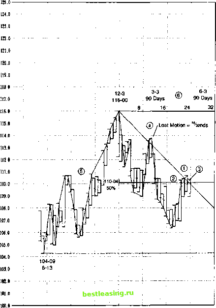 ![]() 6/21/96 в/16/96 10/11/96 12/6/96 1/31/97 3/28/97 5/23/97 7/18/97 Рис. 9.51 Объединение горизонтальных и диагональных индикаторов цены. С углом Ганна 110-08 (Т) и 50% цены 110-40 @; Зона сопротивления от 110-04 до 110-08 (3). Используйте предыдущий холостой ход для определения стопа (4). Определите тренд (5) и временной период (6). Заключение: тенденция идет вниз. Время указывает, что рынок может упасть до 3 июня. Продавайте на 110-04 до 110-08 со стопом, большим, чем 16 тиков. 10 Время Ганн считал время наиболее важным фактором воздействия, способствующим точному определению изменений в тенденции. Он измерял время различными способами, включая естественные циклы, ежегодно отмеченные даты, сезонность, циклы колебаний и даты, возведенные в квадрат. В этой главе мы будем обсуждать различные способы определения вершин, оснований и изменений в тенденции, которые ориентируются на использование времени. Начнем мы с самого сложного метода (естественные циклы) и закончим самым популярным (возведение времени в квадрат). Естественные циклы считаются наиболее сложным понятием, потому что они связаны с финансовой астрологией, которая для успешного применения требует серьезной теоретической подготовки и особых способностей. Возведение времени в квадрат считается самым популярным методом, так как включает в себя использование графиков для прогнозирования вершин и оснований, а также изменений в тенденции. Многие из приемов, изученных в Главе 9, применяются и здесь. Таким образом, опыт исследований, приобретенный в процессе изучения динамики ценового графика, будет закреплен, в особенности, при использовании представленного здесь технического метода, ориентирующегося на время. Анализ времени, подключающий сезонные и графики колебаний, дополнит информацию, приводимую в Главах 4-7. ЕСТЕСТВЕННЫЕ (ПРИРОДНЫЕ) ЦИКЛЫ Естественный, или природный, цикл является временным периодом, который может быть измерен и спрогнозирован, поскольку он основан на безусловном действии законов природы. Основная парадигма строится на некоей фатальности и предопределенности, потому что природный цикл не может быть изменен человеком. Может варьироваться результат, но наличие цикла - неизменно. Астрономические аспекты Планеты. Позиции планет и их аспекты (энергетические каналы связи) оказывают серьезное влияние на все происходящее. Планеты движутся и образуют специфические сочетания, такие как сцепка, квадрат (квад-риль), тригон и противостояние (оппозиция). Например, две или более планеты, соединяясь в одном градусе, находятся в сцепке. Две или более планеты, расположенные в 90 градусах друг от друга, образуют квадрат, в 120 градусах друг от друга - тригон, а в 180 градусах друг от друга -противостояние. Эти конфигурации финансовыми астрологами разделяются на два класса: бычьи и медвежьи. Бычьи явления - это сцепка и три- гон, в то время как медвежьи явления - это квадрат и противостояние. Вероятно, Ганн, подобно другим финансовым астрологам, изучал эфемериду (таблица движений планет), чтобы обнаружить основные закономерности для предсказания вершин, оснований и будущих направлений развития рыночной тенденции. Поскольку будущее расположение планет могло быть предсказано с помощью эфемериды, Ганн имел возможность построить прогноз рынка на будущие годы, используя в качестве ориентира наблюдаемые планетарные закономерно