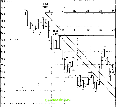 Максимум ![]() Закрытие Минимум Рис. 3.1 График б Ганн-Формате роль в построении графика, то многие из чартистов могут предпочесть один график другому. Шкала Графическая шкала важна для построения графиков цены и времени из-за способности ценового движения быстро меняться в течение периода времени. График цены и времени или Ганна-формат график должен иметь шкалу один к одному и одинаковое количество квадратов в ячейках вверх и вправо. Например, Ганн предпочитал 8 и 12 сетчатый график на дюймовой диаграммной бумаге (Рис. 3.2). Это дает возможность взглянуть на рынок, расчерченный на квадраты, что необходимо при построении углов Ганна от вершин и оснований. Линия, проведенная по диагонали от одного к другому углу на таком типе графика, делит квадрат ровно на две половины, тем самым, создавая правильный 45 градусный угол. Если у вас нет программы Ганнтрейдер 2, и нет никакого желания рисовать графики вручную, тогда вам нужно использовать графики, созданные другой программой. Но эти типы графиков часто являются причиной возникновения проблем для анализаторов Ганна, потому что они специально приспособлены для прямоугольной формы экрана. При использовании таких программ, как Omega Super Charts или Omega TradeStation, аналитикам важно подогнать шкалу графика на экране под надлежащую цену и временную шкалу анализируемого рынка. Например, график соевых бобов должен быть построен по шкале 1 цент в день или график казначейских облигаций должен быть построен по шкале 4/32-ых в день. Хотя углы Ганна, вычерченные от вершин или оснований на квадратном графике, продуцируют 45 градусные углы, то просто нарисованные 45 градусные углы от вершин или оснований на графике при использовании неправильной шкалы, не смогут образовать углы на тех же точках, как на графике с правильной шкалой. А это означает, что рынок вряд ли будет следовать по таким углам в нисходящей и восходящей тенденции. Когда это происходит, трейдер теряет способность точно прогнозировать будущее движение цены, а также выявлять поддержку и сопротивление. ГРАФИКИ В ГАНН-ФОРМАТЕ 27 75.0 НА 716 ![]() 71.0 ТО.В 70.6 7М 70.2 2/25/97 3/7/97 3/19/97 4/1/97 4/11/97 4/23/97 5/5/97 5/15/97 Рис. 3.2 График в Ганн-Формате с правильной шкалой. Углы имеют математическую взаимосвязь с рынком. 1НМ7-ОД Д Т С-ЫНО ..И 0-T W Н*И L.TS.J7 У-ЗвМ 7 f b Mir Ad Umt Рис. 3.3 Сжатые бары усложняют применение приемов Ганна при анализе этого графика. (График построен в SuperCharts от Omega Research Inc.)