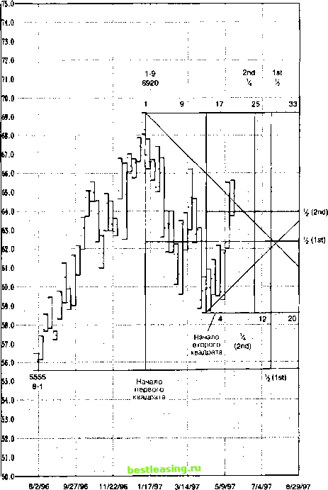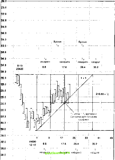 ![]() 1ВО.0 10/25/96 12/20/96 2/14/97 4/11/97 6/6/97 8/1/97 9/26/97 11/21/97 Рис. 10.20 Квадрирование диапазона, важные временные периоды. Вершина = 234.20, основание = 119.00, диапазон = 3520. шкала = 100. 1 квадрат = 35.2 недели, 1/4 = 8.8 недель. 1/2= 17.6 недель, 34 = 26.4 недели. Важно отметить все эти временные периоды на графике, так как они представляют собой даты, в которых рынок может образовать вершину или основание. Часто рынок именно на этих датах демонстрирует высокую волатильность. Эти временные периоды остаются неизменными, пока рынок остается внутри диапазона, который используется для их определения. При выходе из ценового диапазона все эти даты становятся уже недействительными как для вершин, так и для оснований. Так как эти ценовые коридоры зачастую сохраняются в течение долгого периода времени, то предполагается использование достаточно устойчивого основного диапазона либо второго или третьего в порядке убывания ширины. Данные временные периоды часто указывают и подают сигналы о формировании главных вершин или оснований. Кроме того, может быть использован контрактный диапазон, а также и большие ценовые коридоры из дневного графика. Но помните, что эти диапазоны обычно сохраняются значительно дольше срока действия самого контракта. Помимо указанных делений, для обозначения будущих вершин или оснований применяются 33% и 67% временного периода. Они представляют собой 1/зи 2/3 коррекции времени. 33% коррекции времени получаем путем умножения диапазона на 0.33, а 67% - путем умножения диапазона на 0.67. В нашем примере, если диапазон 50,тогда 33% коррекция времени соответствует 16,5 месяцам, неделям или дням. 67% коррекция времени диапазона 50 соответствует 33,5 месяцам, неделям или дням. Временные кластеры. Как уже ранее говорилось в этой главе, лучшее время для ожидания вершин и оснований наступает, когда две или более хронометрируемые даты оказываются в тех же самых временных периодах. Рынок состоит из нескольких основных диапазонов, объединяющихся для образования контрактного диапазона или непревзойденного диапазона (ценового коридора, который цены не могут покинуть). Из-за такого наложения иногда несколько квадратных дат возникает одновременно. Например, может наступить такой момент, когда 1/4 одного квадрата будет относиться к тем же неделям, к каким будет относиться график колебаний квадрата другого диапазона (рис. 10.21). Очень важно отслеживать эти ситуации, так как зачастую они связаны с формированием главных вершин и оснований. Особенно это реально для рынка, торгующего на или рядом с исторической вершиной или основанием (рис. 10.22). Квадрирование максимальной цены Одним из технических приемов, применяемых Ганном, было квадрирование максимальной цены. Квадрирование рынка максимальной ценой создает дополнительные временные периоды, позволяющие вести наблюдение за образованием вершин и оснований. Особенно это важно на недельном графике. Для того, чтобы квадрировать максимум, аналитик должен знать основную вершину и шкалу, используемую для определенного рын- ![]() Рис. 10.21 Квадрирование диапазона, квадрат внутри квадрата 1 2 3 4 5 6 7 8 9 10 11 12 13 14 15 16 17 18 19 20 21 22 23 24 25 26 27 28 29 30 31 32 33 34 35 36 37 38 39 40 41 42 43 44 45 46 47 48 49 50 51 52 53 54 55 56 57 58 59 60 61 62 63 64 65 66 67 68 69 70 71 72 73 74 75 76 77 78 79 80 81 82 83 84 85 86 87 88 89 90 91 92 93 94 [ 95 ] 96 97 98 99 100 |