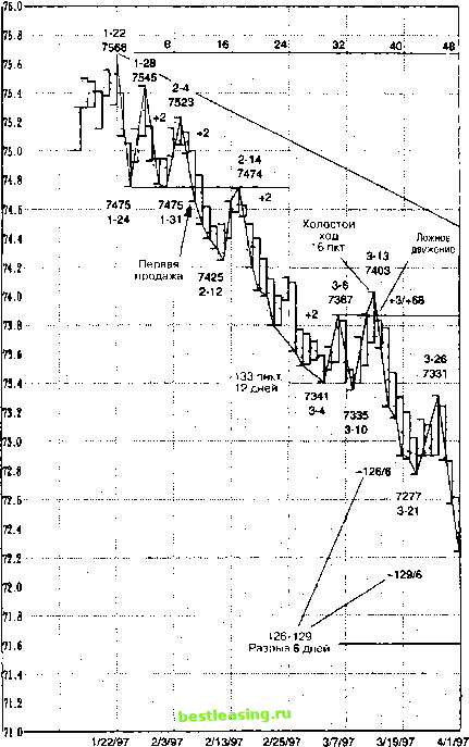 Каждые 77 недель или, приблизительно, каждые 1 1/2 года от недели, закончившейся 21 февраля 1987 г., трейдер должен наблюдать за образованием будущих вершин или оснований. Несмотря на то, что квадрирование минимума производится, в основном, в сочетании с недельным графиком, другие графики также могут быть использованы, в особенности - месячный график. Поясним: на примере кукурузы - основной минимум 1.54 появился в феврале 1987 г. Шкала составляет 8 центов в месяц, и месячный график июльской кукурузы должен квадрироваться каждые 19 месяцев. Это значит, что от данного основного минимума главная вершина или основание могут прогнозироваться каждые 19 месяцев. В данном случае - это март 1998 г., который может стать важным временным периодом образования главной вершины или главного основание. На этом мы завершаем наше обсуждение графиков квадратов. Квадрат диапазона, квадрат максимума и квадрат минимума - три, возможно, самых важных инструмента временного характера среди применяемых Ганном для прогнозирования вершин и оснований. Они используют цены для определения времени возможного образования вершины или основания. Для успешного применения этого метода необходимо изучение теории и практика. Условием его надежности является тщательный анализ. Тогда квадрат с необходимой точностью сможет указать, где следует ожидать появления вершины или основания.В совершенстве овладев этим методом и хорошо зная особенности рынка, на котором вы хотите его применить, вы скоро сможете убедиться в его достоинствах. ЗАКЛЮЧЕНИЕ Рынки, как известно, складываются из цены и времени. Идея успешной торговли состоит в равновесии этих двух составляющих, из которых, дна-ко, время является более сильной. Чтобы определять время образования вершин или оснований, грейдер должен владеть различными методами. Хронометраж может быть осуществлен путем выявления циклов, как естественных, так и адаптивных. Естественные циклы представлены природными явлениями, связанными с движением планет, а также могут быть созданы прошлым рыночным действием, - таким, как ежегодные даты и дробление времени. Хронометраж может также проводиться с использованием адаптивных методов -квадрата ценового диапазона, квадрата максимума и квадрата минимума. Продолжительность восходящих и нисходящих колебаний также может быть использована для прогнозирования будущих вершин и оснований. И, наконец,настоятельно рекомендуется сочетать различные методы работы со временем в практической деятельности. Опыт показывает, что группировки индикаторов времени наиболее эффективны для выявления вершин и оснований рынков. Итак, вы познакомились с основами анализа Ганна. Заключительная глава приводит примеры использования этих технических приемов на реальном рынке. 11 Применение техники Ганна КАНАДСКИЕ ДОЛЛАРЫ НА ИЮНЬ, 1997 ГОД, ДНЕВНОЙ ГРАФИК Индикатор промежуточной тенденции Рассмотрим анализ контракта на канадский доллар, торгуемого на июнь 1997 г., дневной график (рис. 11.1), который торгуется на экстремальном уровне, чуть ниже максимума, который наблюдался для этого контракта -76.35. Вершина промежуточной тенденции была образована на 7568, что произошло 22 января 1997 г., после чего последовали два последовательно снижающихся бара с наименьшими минимумами. Первое двухдневное основание было образовано 28 января на