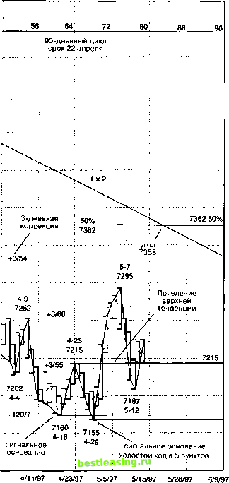 ![]() Рис. 11.1 продолжение ктов за три рыночных дня. Опять время уравновесилось точно, но цена оказалась на шесть тиков ниже. Следующий прогноз - 126-129 пунктов за шесть рыночных дней. Падение от 7262 привело рынок к 7160, то есть -102 пункта за семь рыночных дней. Снижение цен продлилось на один день дольше, но цена оказалась очень близка к объявленной цели 7139-7136. Это явилось первым признаком того, что рынок готовится изменить тенденцию. Когда рынок находится на экстремально низком уровне, в момент достижения нового минимума по контракту, пора приступить к наблюдению за образованием основания. Низ на 7160, достигнутый 18 апреля, был образован как сигнальное основание. Это еще один признак, что рынок готовится либо преодолеть основание, либо изменить тенденцию. Последующая поправка: от 7160 до 7215 - составила 55 пунктов за три дня. Эта корректировка уравновесилась предыдущими корректировками и показала, что рынок может обмануть ожидания, не удержавшись на основании 7160. Следующий спад был до уровня 7155, взятого 29 апреля, где снова установилось сигнальное основание, но - уже следующее. Как свидетельствует общая практика, два сигнальных основания за семь дней обычно являются сильнейшим признаком того, что последнее основание совсем близко. Рынок поднялся от 7155 и индикатор промежуточной тенденции развернулся вверх, когда рынок пересек вершину последнего колебания на 7215. Снижение цен от 7160 до 7155 составило только 5 пунктов, после чего тенденция изменилась и направилась вверх. Этот спад можно приписать эффекту холостого хода. Теперь, при восходящей главной тенденции, рынок начал приобретать черты бычьего, так как подъемы стали превышать предыдущие коррекции с точки зрения и цены, и времени. Для восходящей основной тенденции и наличия длинной позиции в ней также необходим прогноз. Первое устойчивое продвижение курса вверх было от 7155 до 7295, или - 140 пунктов, за шесть рыночных дней. Первое снижение, сопровождаемое изменением в тенденции, составило 108 пунктов за три дня. Это действие прогнозирует подъем на 140 пунктов за шесть рыночных дней от основания 7187. Прогноз рекомендует торговлю от 7327 в районе 20 мая 1997 г. Несмотря на то, что рынок поднялся до 7350 - 16 мая, цена шла несколько впереди времени, поэтому рынок скор-ректировался обратно, спустившись к 7327 именно 20 мая. Действительное закрытие было на 7327. Эти действия рынка доказали, что цена и время уравновесились. Объединение угла Ганна и уровня процентной коррекции Подъем от 7155 закончился, когда рынок стал торговаться на 7362, что произошло 21 мая 1997 г. Рынок распродавался принаправлении развития торговли в основную зону сопротивления. Главный ценовой диапазон, образованный от вершины 22 января до основания 29 апреля, составлял от 7568 до 7155. Этот коридор определил 50% уровень на 7362. Угол Ганна 1x2, двигавшийся вниз со скоростью 2V2 пунктов в день был на 7358 именно 21 мая. Это образовало зону сопротивления на 7358-7362, которую рынок не сумел прорвать, а только испытал ее на разрыв , испробовав силу оказываемого сопротивления. Временной анализ. Первая промежуточная вершина была образована 22 января 1997 г. Планируя по 90-дневному циклу следующее главное основание либо изменение в тенденции, прогноз указывает на 22 апреля 1997 г. Первое основание было достигнуто на уровне 7160, что произошло 18 апреля, то есть, на два дня раньше цикловой даты. По