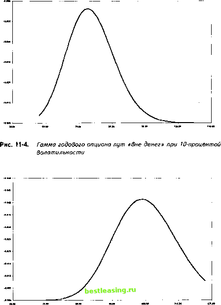 цена исполнения отстоит на 15% от текущей цены при 10-процентной волатильности. Рисунок 11-5 показывает гамму годового опциона колл далеко вне денег , тоже с ценой исполнения, удаленной на 15% от текущей цены базового актива. Изучение характера поведения данных опционов показывает, что в потенциале они позволяют устранить резко возрастающий риск при сильном отклонении цен хеджируемого актива. Но может сложиться так, что на рынке могут отсутствовать опционы на кэт -бонды, и при этом нет желающих выписать подобные опционы на внебиржевом рынке. В этом случае можно попытаться найти контрагента, готового пойти на заключение свопциона (swaption), опциона на своп, в котором участвует кэт - бонд. Если все эти варианты оказываются безрезультатными, остается найти рынки, совокупно ведущие себя в про-тивофазе относительно рынка кэт -бондов. Это- сложно, но реально хотя бы частично. Многое зависит от структуры катастрофного индекса. Например, если мы имеем дело с кэт -бондом, способным сильно реагировать на климатические катастрофы, особенно в определенном регионе, то наверняка сумеем обнаружить связь с сельскохозяйственным рынком, а также обратиться к реагирующим косвенным образом рынкам, например: государственным бумагам, производным на температуру, фондовым ценностям и т.д. В некоторых случаях удастся найти широкий выбор инструментов, в других - не слишком. Как бы там ни было, если существует возможность, то остается совсем немного - определить издержки на покрытие риска, а также насколько они целесообразны с точки зрения наличия альтернатив инвестирования и механизмов управления рисками. Безусловно, задача существенно облегчается при наличии рынка производных на кэт - бонды. Использование опционов в данном случае понятно, и в комментариях не нуждается. Более интересно понять, как может быть применена техника игрока волатильности к управлению риском от владения кэт - бондом. Если покрытие риска может быть обеспечено длинными опционами вне денег (потребность в использовании опционов определенного класса - колл или пут - зависит от структуры ценообразования производного инструмента), то положение выписавшего опционы вне денег отражает позицию продавца волатильности. Очевидно, так как эти опционы не обладают высокой дельтой, хеджирование их не отнимает много ресурсов. Скажем, для покрытия риска коротких опционов, чья гамма изображена на рисунках 11- 4 и 11-5, не требуется более одного базового актива на 12 опционных контрактов. Таким образом, продавец опционов имеет возможность управлять их риском, прибегая к ребалансировке. Из этого следует чрезвычайно ![]() Рис. 11-5. Гамма годового опциона колл вне денег при 10-процентой волатильности важный вывод: если контрагент лица, хеджирующего позицию в кэт - бонде длинным опционом, устраняет свой риск рехеджированием, то аналогичным образом может вести себя и он сам. То есть можно отказаться от покрытия риска через длинный опцион, а применить технику управления риском волатильности, действуя так, будто в портфеле содержится короткий опцион, против которого открыты позиции в базовом активе (в нашем случае производные инструменты) в объеме, который обеспечивает нейтральность относительно рынка. При этом есть два важных замечания. Во-первых, короткий опцион следует рассматривать обособлено от других сос