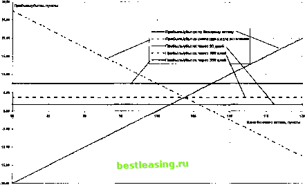 ![]() Рис. 2-10. Портфель, содержащий базовый актив и короткую синтетику из годовых опционов, работает как безрисковая твер-допроцентная бумага освещенных выше. Для этого необходимо их переписать, представив в виде общего выражения: Базовый актив = колл - пут. То есть записывать короткие позиции со знаком минус : - колл , - пут , -актив , а длинные со знаком плюс . Из этой формулировки, пользуясь предлагаемым алгоритмом, можно вывести выражение для любой синтетической позиции: длинного или короткого колла, пута или базового актива. Например, короткая позиция по базовому активу будет выглядеть так: - базовый актив = - колл + пут . А запись для длинного опциона пут: пут = базовый актив- колл и т.д. Хотя на рынке постоянно соблюдается паритетность между опционами пут и колл, заставляя предположить отсутствие расхождения между позицией в одном инструменте и в синтетике, за исключением разницы в размере требуемого капитала, тем не менее, исходы использования того или иного портфеля могут оказаться различными. Кроме того, каждый из них создает свои варианты управления позицией, час- то основывающиеся на противоположных предпосылках и предположениях относительно итоговых результатов. Позже мы вернемся к этому вопросу. Резюме Математический аппарат позволяет на основе принятой для использования на рынке модели ценообразования найти характеристики, позволяющие выяснить чувствительность опционов к изменению рыночных условий. Дельта опциона дает возможность оценить экспозицию - степень эквивалентности стратегии базовому активу. Гамма и вега приобретают серьезное значение при работе с низковолатильными активами. Тэта, иллюстрирующая скорость процесса временного распада, всегда позитивно сказывается на результатах при продаже волатильности и негативно - при покупке. Общепринятая процедура оценки тэты на 365 - дневной базе не может быть признана неоднозначно практичным методом. Если требуется оценить наихудший вариант для покупателя и наилучший для продавца - лучше прибегнуть к расчету, пользуясь числом рабочих дней, а не календарных. Прибегая к опциону и базовому активу можно синтезировать опцион другого класса. Одновременно, с помощью опционов разных типов открывается возможность воссоздать базовый актив. На реальном рынке с помощью синтетически создаваемых инструментов реально построить портфель, не имеющий риска, но с доходностью, значительно превышающей вложения в государственные ценные бумаги. Синтетические позиции в большом числе случаев обладают преимуществом по сравнению с базовым активом, чье поведение они имитируют. Глава ВВЕДЕНИЕ В ТОРГОВЛЮ ВОЛАТИЛЬНОСТЬЮ Торговля волатильностью - увлекательная идея, притягивающая своей возможностью быть безразличным по отношению к рынку. Торговца волатильностью мало волнует общее направление ценового движения, его интересы сосредоточены на колебаниях и больше ни на чем. В огромном числе случаев торговля волатильностью рассматривается сквозь призму арбитражной торговли, обеспечивающей равновесие портфеля относительно рынка и создающей ему иммунитет от ценового риска. Если исходить из этих предпосылок, может показаться, что философия регулярного хеджирования малоэффективна, так как теория утверждает: рынок невозможно обмануть и арбитраж, обеспечивающий безрисковую прибыль, 