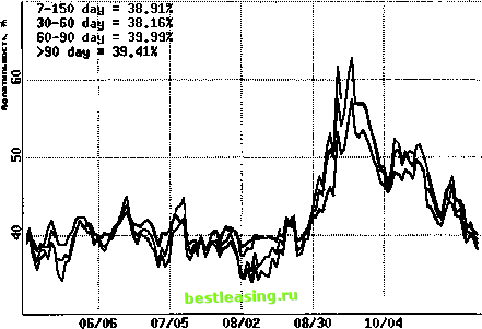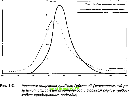 ![]() Рис. 3-1. Подразумеваемая волатильность опционов на Microsoft (MSFT, Nasdaq) за 6-месячный период правится цена. Аналогично и с волатильностью: здесь тоже требуется понять, куда она пойдет. Но первая отличительная черта волатильности состоит в значительно более высокой предсказуемости по сравнению с ценой базового актива. Конечно, волатильность может падать ниже исторических минимумов, но вероятность этого значительно меньше, чем у цены. Аналогично - максимум, достигнутый волатильностью, может развиться в еще большую вершину, но предел роста волатильности существенно легче определить в сравнении с потенциалом повышения цен, особенно когда дело касается фондового рынка. Фактически, показания волатильности замкнуты между какими-то исторически складывающимися границами, и обычно не составляет особого труда определить наиболее вероятный сценарий развития дальнейших событий (см. рис. 3-1). Говоря совсем простым языком, это все равно, что торговать RSI или каким-нибудь стохастиком. Каждый знает: выше определенного значения эти индикаторы не поднимутся, как и не опустятся ниже своего абсолютного минимума. Второе преимущество волатильности состоит в возможности предложить нам значительно более широкий арсенал инструментов и гибких стратегий. Что мы можем сделать, используя только базовый актив? У нас есть два варианта: занять в нем длинную или короткую позицию. Если ценовая тенденция совпадает с направленной позицией, будет возникать прибыль, в противном случае - убыток. Напротив, стратегии волатильности предполагают использование всего арсенала финансовых инструментов, способных обеспечить выигрыш из любой ситуации, складывающейся на рынке. Основа для этого - применение опционов, обеспечивающих мобилизацию определенных преимуществ. Наиболее яркое проявление их способности - создание прибыли при вялом рынке, когда цены движутся в коридоре, не принося существенной прибыли держателям базового актива. Нет сомнений, эту возможность обеспечивает только определенный класс опционных стратегий, в то время как другие приносят убыток. Третье превосходство стратегий волатильности в сравнении с традиционными методами - значительно более эффективный менеджмент, как отдельными позициями, так и портфелем в целом. Посмотрите, какой менеджмент является доступным в операциях с базовыми активами? Удерживать позицию и пытаться достичь нужного качества управления рисками, что достигается через определение лимитов по убыткам и прибыли. Техника для этого проста: используются стоп - лосе ордера для вывода убыточных сделок из портфеля и определяется момент для закрытия прибыльных позиций. В связи с появлением новых технологий, облегчающих торговые операции, большое распространение получила краткосрочная торговля, известная как дэйтрейдинг, а среднесрочным трейдерам стало доступным аккуратное отслеживание позиций, что предполагает повышение уровня управления риском. Стратегии, построенные на использовании волатильности, по большей части исходят из концепции динамического управления риском, предлагая целый набор методик, значительно снижающих риск, оставляя при этом потенциал для извлечения прибыли. Фактически менеджмент построен на попытке сдвинуть вероятностное распределение прибыли таким образом, чтобы частично или полностью отс