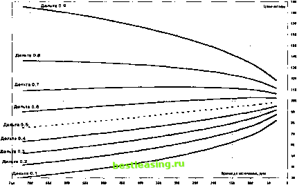 ![]() Рис. 3-5. Экспозиция короткой волатильности Посмотрим теперь, как поведет себя дельта стратегии (ее экспозиция) при увеличении срока до истечения. Таблица 3 - 4 представляет необходимые сведения для анализа, где для создания синтетического стрэддла использовались фондовые опционы с ценой исполнения 100 (исполняемые на 100 акций) при 50 - процентной волатильности. Обратите внимание на аномалию: ниже цены исполнения опционов колл, как и ожидается, мы видим планомерное увеличение экспозиции с увеличением срока до истечения, а выше цены исполнения снижение экспозиции не отличается регулярностью - вначале она действительно уменьшается, а потом начинает возрастать. В чем здесь причина? Это важный вопрос. Дело в том, что опцион фактически торгуется на форвардную цену базового актива, а так как в данном случае мы рассматриваем фондовый рынок, предполагающий рост цен с большей вероятностью, чем их снижение, то это находит свое отражение в дельте опционов. В реальности волатильность опционов разных сроков до истечения на один и тот же актив различается (опционы с меньшим сроком жизни характеризуются более высокой волатильностью по сравнению с более долгоживущими опционами), что приводит к устранению аномалии, несколько выравнивая тенденцию экспозиции. Но Таблица 3-4. Экспозиция синтетических стрэддлов, созданных с помощью 100 коротких акций и двух опционов колл с ценой исполнения 100, волатильностью 50 % при различных сроках до истечения