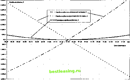 ![]() Рис. 3-7. Профили доходности длинного синтетического стрэддла, а также его составляющих: три коротких фьючерса на швейцарский франк и длинные опционы - два 61-колл и четыре 61.50-колл Таблица 3-6. Прибыль покупателя волатильности - совокупность результатов по фьючерсной и опционной позициям (швейцарский франк и 79-дневные опционы) Цена Изменение, Прибыль/убыток Прибыль/убыток Сумма прибыли/ фьючерса % по опционным позициям по фьючерсным позициям убытков