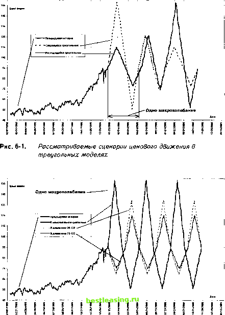 Исходные предпосылки для формирования итоговой таблицы требуют пояснений. Мы полагаем, может существовать одно, два или три колебательных движений, которые назовем макроколебаниями . Число макроколебаний, равное двум, указывает, что цена дважды пробегала от точки создания стратегии к максимуму или минимуму либо в обе стороны. Предположения для случая сужающегося треугольника: каждый последующий максимум не превышает 2/3 от предыдущей вершины до центральной точки отсчета, а минимум соответственно лежит выше предыдущего на 1/3 расстояния от минимума до точки создания стратегии. Основываясь на этом, для второго макроколебания мы определили точки 125 и 75, а третьего - 115 и 78. Предположения для расширяющегося треугольника асимметричны. Рисунок 6-1 демонстрирует прогнозы, сделанные для треугольников. Три последующих сценария предполагают боковой тренд в широком ценовом коридоре: границы приведены в скобках, а рисунок 6 - 2 иллюстрирует эти предположения. Обратите внимание, в данном случае не имеет значения, куда будут вначале двигаться цены - вверх или вниз, так как мы рассматриваем полностью завершенный колебательный процесс, поэтому направление ценового движения не играет никакой роли, что продемонстрировано на рисунке 6 - 2, где цены сначала направились вниз, а потом наверх. В связи с этим отметим, в случае необходимости выяснить результат для колебательного движения, происходящего исключительно выше или ниже точки входа, необходимо составить соответствующие сценарии. Если грубая оценка представляется достаточной, этого можно избежать, так как соотношение результатов по первому и второму сценарию из таблицы 6 - 5 соотносятся как 2 к 1 для тактики рехеджирование на каждом уровне . Это позволяет воспользоваться результатами таблицы, скорректировав их на 35% в меньшую сторону для рынка выше 94 или на 65% для ценовых движений ниже 94. При тактике рехеджирование с положительным результатом достаточно корректировки на 45 - 50%. ![]() Рис. 6-2. Рассматриваемые сценарии ценового движения в боковом тренде Чтобы получить окончательную оценку от ребалансировки по каждому сценарию, требуется дополнить ее результатами от операций, приводящих к полному хеджу. Для этого можно воспользоваться сведениями из последней колонки таблицы 6 - 5. Это даст увеличение числа сценариев в таблице 6 - 6 втрое для каждого случая, за исключением сужающегося треугольника , потому что в данной таблице рассматривается ситуация, когда цена возвращается к точке создания стратегии. А у нас есть еще два варианта: цена оказывается вверху или внизу, причем - без учета вариаций, связанных уровнем цен. Чтобы не перегружать материал книги, оставим эту работу для самостоятельного изучения, а сейчас применим упрощенный способ анализа. Нам известно: хеджирование неиспользованной экспозиции дает дополнительно к дате истечения от $450 до $1250 (см. табл. 6 - 5, последняя колонка), так что в среднем мы можем рассчитывать на $850. С учетом погрешностей и отклонений реально ожидать по крайней мере $500 (60% от $850), которые можно добавить к данным в каждой ячейке за исключением случая сужающийся треугольник . Для оценки результативности стратегии достаточно сравнить полученные данные с премией, уплаченной/полученной при покупке/про-даже опционов. Вспомним, она составляет $3800, и если цена акции к дате ист