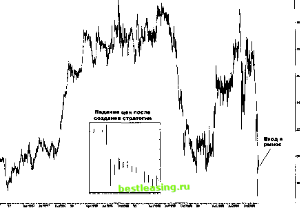 Вне всякого сомнения, было бы здорово отстоять все падение с самой вершины до дна. Скажем, с $20 до $3, введя 900 коротких акций (позиция, требующая в самом начале $9000 маржи). Но кто мог в середине ноября, когда создавалась стратегия, уверенно сказать, что цена будет в очень недалеком будущем менее 3 долларов за акцию? Всегда хорошо быть прозорливым, когда известен результат... Пример №2. Продажа волатильности на PG&E Corporation В конце декабря 2000 г. резко возросла волатильность опционов, торгуемых на акцию PG&E Corporation (NYSE: PCG). Динамику ее поведения можно увидеть на рисунке 7 - 3. Этот факт обусловил возможность применения стратегии продажи волатильности, с управлением риском на основе дельта - нейтральности через изменение экспозиции на 50 (см. табл. 7 - 3). Ориентируясь на взятие быстрой прибыли, выбор пал на ближние опционы - январские, истекающие через 22 дня. Изначальная дельта - нейтральная позиция с небольшим креном в короткую сторону, предполагающая действия с опережением интенсивно меняющейся дельты из-за близости даты истечения, получилась такая: 450 коротких акций по $19.50 и 10 коротких январь - 20 - пут по 3.00. Спустя непродолжительное время цена акции резко обрушилась вниз, причем - с ценовым разрывом. После этого акция до даты истечения торговалась в диапазоне между $8.375 и $12 - 13 (см. рис. 7 -4). В течение всего этого времени позиция ребалансировалась по дельта - и 3 о 2-31-01, bipUied .Vol С1о8в=101.ЯХ Подразумеваемая волатильность за: 2 года ] ![]() 07/08 09/16 11/26 0Z/07 04/17 06/27 09/06 02-21-01: I 11/14 8о1 С1оЕв=101.3Х ; Подразумеваемая волатильность зв 6 месяцев ![]() 08/29 09/18 10/05 10/24 11/10 11/30 12/19 01/09 01/29 Рис. 7-3. Подразумеваемая волатильность PCG за 2-летний и 6-месячный периоды Таблица 7-3. Ордера для ребалансирующих сделок на PCG при торгуемом лоте 50 акций