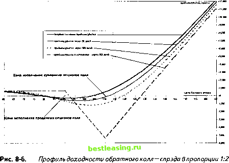 Профиль доходности данной стратегии демонстрирует потенциально неограниченную прибыль в случае повышения цен, гарантированный доход в нижней части рынка и ограниченные потери в диапазоне 92- 128 (см. рис. 8 - 6). Экспозиция опционной стратегии от цены акции в трех временных разрезах дополняет понимание основных рисков и преимуществ данной конструкции (см. рис. 8 - 7). ![]() ![]() Рис. 8-7. Экспозиция обратного колл-спрэда с коэффициентом Цели, преследуемые риск-менеджментом данной стратегии, могут быть двоякими, С одной стороны, трейдер может пожелать зафиксировать прибыль, возникшую в результате роста рынка в условиях достаточности времени до истечения опционов, особенно если возникла опасность возврата цен к точке создания стратегии. Потери в ценовой области 92 - 128 стимулируют другие решения - попытаться снизить убытки, пусть и ограниченного размера. Обе цели могут быть достигнуты через ребалансировку стратегии, свойственной процедурам управления риском стратегии длинной волатильности. Впрочем, об этом можно судить по изгибу профиля доходности рассматриваемого обратного колл -спрэда с коэффициентом. Данный пример существенно отличается от предыдущего: здесь отсутствует острая необходимость управлять риском, потому что он известен в момент создания стратегии. Можно только пытаться снизить убыток, считающийся по умолчанию приемлемым (будь иначе, данная стратегия не создавалась бы трейдером). Раз мы имеем дело с профилем покупки волатильности, режим управления риском которой уже был подробно рассмотрен, то нет причины обсуждать детали. Значительно важнее посмотреть на исходные сведения, требуемые для составления торгового плана, где нас в первую очередь должен волновать лимит открытых позиций в акциях. Добиться аккуратных результатов при расчете ценовых уровней для ребалансировки не так-то просто. Профиль доходности хотя и несильно, но все же ниже цены акции 90 постепенно преобразуется в кривую, характеризующую продажу волатильности - вполне естественное влияние наличия коротких опционов 90 - колл. Для облегчения расчетов имеет смысл разложить обратный колл - спрэд с коэффициентом на две составляющие: медвежий колл - спрэд и длинную позицию из опционов колл. Первая стратегия, создающая ограниченные потери в интересующей нас области (выше 90), вычленение которой из состава стратегии оставляет в нашем распоряжении три длинных опциона колл. Таким образом, мы без всяких затруднений можем рассматривать их как основу стратегии длинной волатильности, создавая с помощью акций противоположно направленные позиции. Автоматически у нас выясняется лимит открытых коротких позиций в базовом активе - в данном случае 300 коротких акций. После этого процедура расчетов уровней ребалансировки длинной волатильности существенно облегчается. Конечно, в расчеты можно включить пропорциональный бэкспрэд целиком, но лучше рассматривать этот вариант как альтернативу вышеприведенной схеме. Часто наиболее удачными оказываются решения, являющиеся компиляцией двух планов управления стратегией, - один основывается на несвязанных обязательствами опционах (длинные позиции), а другой принимает во внимание все опционы, входя- 1 2 3 4 5 6 7 8 9 10 11 12 13 14 15 16 17 18 19 20 21 22 23 24 25 26 27 28 29 30 31 32 33 34 35 36 37 38 39 40 41 42 43 44 45 46 47 48 49 50 51 52 53 54 55 56 57 58 59 60 61 62 63 64 65 66 67 68 69 70 71 72 73 74 75 76 77 78 79 80 81 