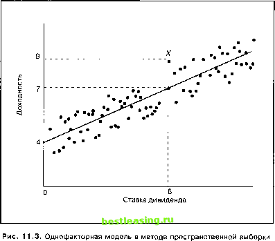 имость собственности акционеров согласно балансовой ведомости фирмы, а под рыночной стоимостью - то же самое, что и размер капитализации, использованный в определении предыдущего фактора. Индекс акций с высоким отношением состоит из тех акций, что находятся в верхней трети спектра значений HMLt, а индекс акций с низким отношением состоит из тех акций, что находятся в нижней трети.) Фама и Френч также определили два фактора, которые объясняют месячные доходности по облигациям. В виде уравнения их факторная модель для облигаций выглядит так: ri, ~ rf, = / + bJERM, + baDEFf + v (11.19) Этими двумя факторами являются фактор временной структуры и фактор риска неуплаты13. Фактор временной структуры (TERM() - это просто разность в месячной доходности между долгосрочными облигациями и одномесячными векселями казначейства. Фактор риска неуплаты (DEFt) - это разность в месячной доходности между портфелем долгосрочных облигаций корпорации и долгосрочными казначейскими облигациями14. 11.4.2 Метод пространственной выборки Метод пространственной выборки (gross-sectional approaches) менее распространен, чем метод временных рядов, но часто оказывается не менее мощным средством. Построение модели начинается с оценки чувствительности ценных бумаг к определенным факторам. Затем для некоторого периода времени оцениваются значения этих факторов на основе анализа доходностей ценных бумаг и их чувствительности к факторам. Этот процесс повторяется для большого числа временных интервалов, что позволяет дать оценки для стандартных отклонений факторов и их корреляций. Заметим, что метод пространственной выборки совершенно отличен от метода временных рядов. В последнем методе известны значения факторов, а чувствительности к ним оцениваются. После чего анализ проводится для одной ценной бумаги на большом числе временных интервалов, затем для другой ценной бумаги и т.д. В методе пространственной выборки известны чувствительности, а оцениваются значения факторов. В этом методе чувствительности иногда называются атрибутивными (attribute). Анализ в этом методе проводится для одного временного интервала и группы ценных бумаг, затем для другого временного интервала и той же группы бумаг и т.д. С целью иллюстрации метода пространственной выборки мы переходим к рассмотрению примеров однофакторной и двухфакторной моделей. Однофакторные модели На рис. П.З приведен гипотетический пример связи между доходностями акций нескольких типов за определенный период времени и одним из атрибутов ценных бумаг - ставкой дивиденда - для каждого типа акций. Каждая точка относится к одному определенному типу акций, показывая их доходность и ставку дивиденда в рассматриваемом временном интервале. В этом примере акции с более высокой ставкой дивиденда имеют тенденцию к более высокой доходности, чем акции с низкой ставкой дивиденда. В то время как рис. П.З (пример метода пространственных выборок) основан на использовании данных по различным типам акций для одного момента времени, рис. ll.l (пример метода временных рядов) основан на данных по одному типу акций для различных моментов времени. Для того чтобы получить количественное выражение связи, показанной на рис. П.З, статистическим методом простой регрессии было проведено приближение точек прямой линией. Уравнение для прямой на рис. П.З имеет вид: ги = 4 + 0