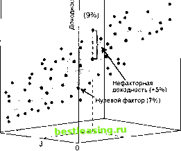 Эту проблему можно частично разрешить, сравнивая доходности с показателями размера капитализации и ставкой дивиденда одновременно и используя статистический метод множественной регрессии. Это проиллюстрировано на рис. 11.4. Каждая ценная бумага представлена точкой на трехмерной диаграмме. При этом доходность в рассматриваемом периоде времени отложена по вертикальной оси, ставка дивиденда в этом же периоде - по одной из нижних осей, а размер капитализации - по другой. Приближение данных с помощью плоскости обычно производится методом множественной регрессии. Для примера из рис. 11.4 это дает следующее уравнение регрессии: rft=7 + 0,4A/1,-0>3Aa,+ e#, (11.23) где bjU и Ьй обозначают соответственно ставку дивиденда и размер капитализации акций типа / в период времени t. В общем виде уравнение регрессии для двухфакторной модели записывается следующим образом: = fl, + *лЛ + *яЛ + V (11.24) где а обозначает нулевой фактор в период времени г, а два фактора обозначены как Fu Показатель , размера капитализации ![]() g Ставка дивиденда Рис. 11.4. Двухфакторная модель в методе пространственной выборки Плоскость, показанная на рис. 11.4, описывается уравнением: 7 =7 + 0,4Аш-0,ЗАя, или в общем случае: =fl,+ V.,+ Vv (11.25) (11.26) Это означает, что нулевой фактор а равен 7%, т.е. от акции с нулевой ставкой дивиденда и нулевым размером капитализации (с рыночной стоимостью в $1 млн.) можно было бы ожидать доходности 7%. Заметим, что оценки для значений фактора ставки дивиденда (F.t) и фактора размера капитализации (F2r) составляют 0,4 и -0,3 соответственно. Таким образом, в рассматриваемый период времени и высокая ставка дивиденда, и малый размер капитализации ассоциировались с большей доходностью. Согласно уравнениям (11.23) и (11.25), следует ожидать, что некоторая ценная бумага Хс дивидендной доходностью 6% и размером капитализации 3 будет иметь доходность 8,5% (7 + 0,4 х 6 - 0,3 х 3). Таким образом, при фактической доходности 9% нефакторная доходность за рассматриваемый период (е ) равна +0,5% (9% - 8,5%), как показано на рис. 11.4. Учет размера капитализации и ставки дивиденда в совокупности с использованием метода множественной регрессии может помочь разделить влияние разности в величине ставки дивиденда и в размере капитализации на доходность ценных бумаг. При этом невозможно адекватно оценить те влияния, которые не были представлены вовсе. Также невозможно гарантировать, что включенные в рассмотрение показатели не являются просто подменой более фундаментальных показателей. Статистические тесты могут указывать на то, что переменные, включенные в анализ, способны объяснить или предсказать доходность ценных бумаг в прошлом. Однако для установления переменных, которые могли бы помочь предсказать доходность ценных бумаг, риски и ковариации в будущем, требуются здравый смысл и удача. Обобщение рассмотренных выше примеров на случай более двух переменных непосредственно следует из уравнений с (11.23) по (11.26). Пример Шарп провел исследование, использующее метод пространственной выборки, для того чтобы установить факторы, объясняющие изменения доходности акций17. В его работе доходности акций ежемесячно были увязаны с пятью чувствительностями ценных бумаг (и восемью сектор-факторами), которые измерялись для каждой разновидности акций. К этим чувствительностям относились размер фирмы (измеренный согласно Фаме и Френчу), коэффи