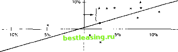 Таблица 17.2 {продолжение) 1. Бета (Б) Вычисления (ТхЕХГ) - (IVxIX) (16x590,80) - (54,84 х 66,62) (ТхХХ2)-(1Х)2 0,63. (16x848,38) -(66,62) 2. Альфа : [ZY/Т] - [Зх(1Х/Г)] = [54,84/16] - [0,63 х (66,62/16)] = 0,79% . 3. Стандартное отклонение случайной ошибки: {[1У2-(ахЕУ)-(Рх1ЛУ)]/(Т-2)},/2 = = {[ 1039,03 - (0,79х54,84) - (0,63 х590,80)]/( 16- 2)} 1/2 = 6,67% . 4. Стандартная ошибка беты : Стандартное отклонение случайной ошибки/jlX2 - [(IX)2/т]} 1/2 = = 6,67/(848,38-[(66,62)2/1б]} 1/2 =0,28. 5. Стандартная ошибка альфы : Стандартное отклонение случайной ошибки/т- [(ХХ)2/ХХ2 ] 1/2 = = 6,67/{l6-[(66,62)2/848.38]}1/2 =2,03. 6. Коэффициент корреляции: (Тх1ХУ)-(1Ух1Х) {[(Тх1У2)-(ХУ)2]х[(ТхХХ2)-(ХХ)2]}1/2 (16 х 590,80) - (54,84 х 66,62) {[(16 х 1039,03)- (54,84)2 ] х[(16х848,38) - (66,62)2 ]} = 0,52. 7. Коэффициент детерминации: (Коэффициент корреляции)2 = (0,52)2 = 0,27 . 8. Коэффициент неопределенности: 1 - Коэффициент детерминации = 1 - 0,27 = 0,73 . *Все вычисления сделаны за период , где f находится в пределах от 1 до Т(в этом примере t= 1, 2..... 16). Рыночная модель WM на рис. 17.7 соответствует линии регрессии, построенной с помощью точечной диаграммы. Поскольку прямая характеризуется своим наклоном и точкой пересечения с осью ординат, можно показать, что значения беты и альфы , при которых построенная прямая наилучшим образом приближена к графику точечной диаграммы, определяются однозначно. Иначе говоря, не существует прямой, которая бы давала меньшее значение для стандартного отклонения случайной ошибки. Таким образом, построенную прямую также называют прямой наилучшего приближения. Иначе говоря, прямая наилучшего приближения - это та прямая, которая минимизирует сумму квадратов величин случайной ошибки. То есть 16 значений случайной ошибки, соответствующих линии регрессии, возводятся в квадрат и затем суммируются. Полученная таким образом сумма для прямой наилучшего приближения меньше, чем для любой другой прямой. 14 квартал ![]() 10% -- Рис.17.7 Рыночная модель для WM Например, если альфа равняется 1,5 и бета - 0,8, то с помощью равенства (17.8) величина случайной ошибки е. вычисляется для всех 16 кварталов. С помощью этих 16 значений можно вычислить стандартное отклонение случайной ошибки, просуммировав их квадраты и разделив сумму на 14 (16-2). Стандартное отклонение случайной ошибки будет равно квадратному корню из этого числа. Однако полученный результат будет больше, чем 6,67%, что составляет стандартное отклонение случайной ошибки для прямой наилучшего приближения, т.е. прямой, для которой альфа равна 0,79, а бета - 0,63. Заметим, что истинное значение коэффициента бета ценной бумаги невозможно установить, можно лишь оценить это значение. Так что даже если бы истинное значение беты оставалось постоянным всегда, его оценка, полученная по методу наименьших квадратов, все равно менялась бы во времени из-за ошибок при оценке (называемых ошибками выборки). Например, если при оценке используются различные выборки 16 кварталов, то полученные оценки беты для ценных бумаг WM будут почти всегда отличаться от 0,63 - величины, полученной для 16 кварталов, приведенных в табл. 17.2. Стандартная ошибка для беты (standard error of beta) есть попытка оценить величину таких ошибок. При необходимых предположениях (например, что истинное значение беты не менялось в течение оцениваемого 16-квартального периода) с вероятностью примерно У, можно утверждать, что истинное значение беты лежит в пределах величины стандартной ошибки от ее оценочного значения. Так, истинное значение беты для WM, скорее всего, составляет не боль