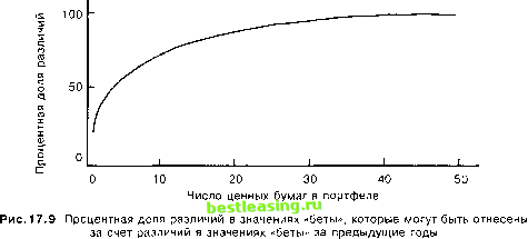 Значение Л-квадрат (R-squared) аналогично равно коэффициенту детерминации, приведенному в табл. 17 . 228. Так, 37% величины колебаний цен акций компании Ask Computer может быть отнесено за счет колебаний рыночного индекса, рассматриваемого за 60-месячный период. Величина остаточного стандартного отклонения (residual standard deviation) соответствует стандартному отклонению случайной ошибки в табл. 17.2. У компании Ask Computer остаточное стандартное отклонение равно 10,82%. Показатель, называемый стандартная ошибка беты (standard error of beta), говорит о том, что примерно в двух случаях из трех истинное значение беты для Ask Computer лежит в интервале от 1,37 (1,65 - 0,28) до 1,93 (1,65 + 0,28). Аналогично показатель, называемый стандартная ошибка альфы (standard error of alpha), говорит о том, что примерно в двух случаях из трех истинное значение альфы для Ask Computer лежит в интервале от -1,47 (-0,06 - 1,41) до 1,35 (-0,06 + 1,41). Седьмая колонка на рис. 17.8 представляет особый интерес. Величина, стоящая в этой колонке, называется скорректированной бетой . Она обсуждается ниже. 17.8.1 Корректировка коэффициента бета В отсутствие какой-либо информации естественно принять в качестве оценки коэффициента бета ее среднее значение, равное I. Если имелась возможность наблюдать за изменениями курса акций по отношению к рыночному индексу за определенный период времени в прошлом, то эту оценку можно попытаться скорректировать. Полученный результат будет лежать в интервале между I и первоначальным значением ( исторической бетой ), основанным исключительно на данных об изменении цен в прошлом. Формальные процедуры проведения таких корректировок были приняты большинством инвестиционных фирм, оценивающих коэффициент бета . Конкретные корректировочные формулы различаются от периода к периоду и для разных видов акций. На рис. 17.8 скорректированная бета (adjusted beta) была получена путем комбинации среднерыночной беты весом примерно 34% и исторической беты с весом примерно 66% для каждой акции. Так, скорректированная бета для акций компании Ask Computer равна 1,43 [(0,34 х 1) + (0,66 х 1,65)]. В общем виде: /За =(0,34 х 1,0) + (0,66 */? ), (17.9) где Ра и Ph - скорректированная и историческая бета соответственно29. Из равенства 17.9 видно, что указанная процедура поправки корректирует значение исторической беты в сторону приближения к 1. То есть если историческая бета меньше 1, то скорректированное ее значение будет больше исторической беты , но не превысит 1. А если историческая бета была больше 1, то скорректированное значение окажется меньшим, но не менее 1. Так происходит потому, что веса 0,66 и 0,34 положительны и в сумме составляют 1. Это говорит о том, что данная процедура является усреднением. Таблица 17.3 показывает, насколько подобная процедура отражает различия между исторической и будущей бетой . Во второй колонке приведены нескорректированные исторические беты для восьми портфелей, каждый из которых содержит по 100 ценных бумаг. Указанные показатели вычислены на основе месячных колебаний цен за периоде июля 1947 г. до июня 1954 г. (портфели были подобраны таким образом, чтобы их беты за этот период существенно отличались друг от друга). В третьей колонке таблицы приведены значения, полученные после процедуры корректировки, подобной той, что использовалась Merrill Lynch. Коэффициенты бета в четвертой колонке основаны на колебаниях цен за последующие 7 лет. Для большинства портфелей скорректиро
