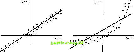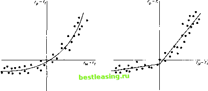 рынка. Почему? Потому что, как это уже отмечалось ранее, ожидаемая доходность портфеля является линейной функцией его коэффициента бета : rp = ap+rf + (rM -rf)pp. (25.23) Это означает, что инвестор хочет иметь портфель с большим значением беты , когда по его ожиданиям доходность рынка превысит безрисковую ставку. В этом случае данный портфель будет иметь большую ожидаемую доходность, чем портфель с малой бетой . Наоборот, инвестор предпочтет иметь портфель с малой бетой в случае, когда он ожидает, что доходность рынка будет ниже безрисковой ставки. В этом случае такой портфель будет иметь большую ожидаемую доходность, чем портфель с высоким значением беты . Проще говоря, инвестор предпочтет: 1. Портфель с высокой бетой при условии, что rM>rf. 2. Портфель с низкой бетой при условии, что гм<г. Если инвестор точен в прогнозах ожидаемой доходности рынка, то его портфель будет более эффективным, чем эталонный, имеющий постоянную бету , равную средней бете портфеля инвестора. Например, если инвестор формирует портфель с бетой , равной нулю при гм </у, и с бетой , равной 2 при гм >/у, то при достаточно точном прогнозе доходность его портфеля будет выше доходности портфеля с бетой , постоянно равной единице. Однако если инвестор неточен в своих прогнозах и, следовательно, изменяет бету портфеля так, что эти изменения не связаны с реальным изменением рынка, то его портфель будет менее эффективным, чем портфель с постоянной бетой . Например, если инвестор формирует портфель с бетой , равной нулю, когда прогнозы показывают спад рынка, а в действительности рынок растет, и в то же время формирует портфель с бетой , равной 2, когда прогнозы рынка показывают его рост, а в действительности он находится в состоянии спада, то средняя доходность такого портфеля будет меньше, чем доходность портфеля с постоянной бетой . При активном управлении портфелем можно либо изменить среднюю бету рискованных бумаг, входящих в портфель, либо доли средств, инвестированных соответственно в безрисковые финансовые активы и рискованные ценные бумаги. Например, для того чтобы увеличить бету портфеля, можно продать облигации и акции с маленькой бетой , а затем вложить все вырученные средства в акции с большим значением беты . Другим путем может быть продажа векселей Казначейства (или увеличение заимствований) с последующим вложением полученных средств в акции. На рисунке 25.7 по вертикальной оси отложены избыточные доходности двух гипотетических портфелей, а по горизонтальной - избыточные доходности индекса рынка. Прямые, полученные методом стандартной регрессии, показывают положительные значения апостериорной альфы в каждом случае. Однако точечная диаграмма говорит о другом. Точечная диаграмма портфеля, приведенная в части (а) рисунка, позволяет сделать предположение о существовании линейной зависимости между избыточными доходностями портфеля и избыточными доходностями рынка, так как точки расположены близко к прямой регрессии. Из диаграммы также следует, что портфель составлен из ценных бумаг таким образом, что его бета остается примерно постоянной. Так как апостериорная альфа была положительной, то из всего вышесказанного можно сделать вывод, что инвестиционный менеджер удачно идентифицировал недооцененные ценные бумаги и инвестировал в них средства. Точечная диаграмма порт