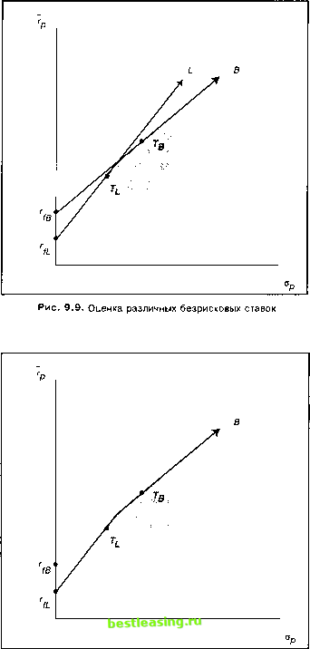Ценная бумага Ожидаемая доходность(в %) Бета Несистематический риск (o2ei) 2 3 4 5 15,0 11,0 10,0 9,0 7,0 1,50 1,10 1,00 0,90 0,70 500 625 600 800 600 Безрисковая ставка равна 4,0%, а дисперсия индекса рынка равна 400. (Желательно использовать электронные таблицы.) Учет различия ставок заимствования и кредитования В этой главе предполагалось, что инвестор может получить взаймы средства по той же самой ставке, по которой он может их инвестировать в безрисковый актив. В результате множество достижимости приобрело вид области, ограниченной двумя лучами, исходящими из точки, соответствующей безрисковой ставке. Верхняя линия представляла эффективное множество и пересекалась только по одному портфелю с эффективным множеством модели Марковица. Этот портфель соответствовал точке касания данного луча с эффективным множеством модели Марковица. Теперь рассмотрим, что произойдет, если предположить, что инвестор может получить заем, но по ставке, превышающей доходность от инвестирования в безрисковый актив. Ставка по безрисковому активу обозначается rfL, где L означает предоставление займа, потому что, как уже говорилось, инвестирование по безрисковой ставке эквивалентно предоставлению займа правительству. Ставка, по которой инвестор может получить заем, обозначается г/в и удовлетворяет условию rfB > rfL. Один из способов оценки влияния сделанного предположения на эффективное множество заключается в следующем. Во-первых, рассмотрим, как будет выглядеть эффективное множество, если получение и предоставление займа возможны по одной и той же ставке г Результирующее эффективное множество является прямой линией, проходящей через точки rfL и TL (рис. 9.9). Во-вторых, рассмотрим, что произойдет, если величину ставки увеличить до г/в, но оставить равной для получения и предоставления займа. Результирующим эффективным множеством будет прямая линия, проходящая через точки г в и Тв (рис. 9.9). Заметьте, что портфель Тв расположен выше портфеля TL на эффективном множестве Марковица, поскольку он является точкой касания для прямой, соответствующей большей безрисковой ставке. В-третьих, поскольку инвестор не может получить заем по ставке rfL, то часть линии, выходящей из г , которая продолжается правее TL, недоступна для инвестора и поэтому далее не рассматривается. Приложение А ![]() Рис. 9.10. Эффективное множество при неравных безрисковых ставках В-четвертых, поскольку инвестор не может предоставить заем по ставке / то часть линии, выходящей из rfB, которая располагается левее TL, недоступна для инвестора и поэтому также не рассматривается. Северо-западная граница множества оставшихся в рассмотрении портфелей, показанного на рис. 9.10, является результирующим эффективным множеством. Это множество состоит из трех различных, но соединенных между собой частей. Первой частью является прямой отрезок, соединяющий / и TL, который представляет собой комбинации различных объемов безрискового кредитования в сочетании с инвестированием в портфель рискованных активов TL. Второй частью является участок кривой из эффективного множества Марковица, соединяющий точки TL и Тв. Третьей частью является прямой луч, выходящий из точки Т, который представляет различные комбинации заимствования в сочетании с инвестированием в рискованный портфель Тв. Оптимальным портфелем для инвестора, как и прежде, будет портфель, 