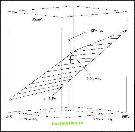 Величина внутри квадратных скобок является средним нефакторным риском для отдельных ценных бумаг. Но нефакторный риск портфеля составляет лишь \/N часть этой величины из-за множителя X/N перед скобками. По мере того как портфель становится более диверсифицированным, число N ценных бумаг в нем растет. При этом 1/yVуменьшается, что, в свою очередь, уменьшает нефакторный риск портфеля. Проще говоря, диверсификация уменьшает нефакторный риск7. 2,2, ,2 Многофакторные модели Состояние экономики затрагивает большинство фирм. Поэтому можно полагать, что изменения в ожиданиях относительно будущего состояния экономики имеют очень большое влияние на доходности большинства ценных бумаг. Однако экономика не является чем-то простым и монолитным. Можно выделить несколько факторов, оказывающих влияние на все сферы экономики. 1. Темпы прироста валового внутреннего продукта. 2. Уровень процентных ставок. 3. Уровень инфляции. 4. Уровень цен на нефть. 11.3.1 Двухфакторные модели В отличие от однофакторных моделей многофакторная модель доходности ценных бумаг, учитывающая эти различные воздействия, может быть более точной. В качестве примера рассмотрим модель, в которой предполагается, что процесс формирования дохода включает два фактора. В виде уравнения двухфакторная модель для периода t записывается так: г. = a. + b.,Fu + b.,F. + е., , (П.7) (/ / il it /2 2/ it 4 где F и F2i - два фактора, оказывающих влияние на доходы по всем ценным бумагам, а 6 и Ь.2 - чувствительности ценной бумаги / к этим двум факторам. Как и в случае однофакторной модели, е.; - случайная ошибка, а - ожидаемая доходность ценной бумаги / при условии, что каждый фактор имеет нулевое значение. Рисунок П.2 иллюстрирует случай акций компании Widget, на доходность которых влияют ожидания как темпов прироста ВВП, так и уровня инфляции. Как и в одно-факторном случае, каждая точка на рисунке соответствует определенному году. Однако на этот раз каждая точка определяется комбинацией доходности, уровня инфляции и темпов прироста ВВП в этом году, приведенных в табл. ПЛ. Россыпь точек совпадает с двухмерной плоскостью, полученной с помощью статистического метода множественной регрессии (multiple-regression analysis). (Слово множественная относится к тому, что в правой части уравнения имеются две экзогенные переменные: ВВП и инфляция.) Эта плоскость для любой ценной бумаги описывается уравнением, похожим на уравнение (П.7): г = а + 6,ВВП + 6, х INF + е . I \ I 2 11 Наклон плоскости в направлении темпа прироста ВВП (Ьх) представляет чувствительность акций Widget к изменениям темпа прироста ВВП. Наклон плоскости в направлении уровня инфляции (Ь2) представляет чувствительность этих акций к изменениям уровня инфляции. Отметим, что в этом примере чувствительности и положительны, и отрицательны и имеют значения 2,2 и -0,78. Это указывает на то, что с увеличением предсказанного темпа прироста ВВП или уровня инфляции доход по акциям Widget должен возрасти или уменьшиться соответственно. ![]() Рис. 11.2. Двухфакторная модель Смещение (нулевой фактор), равное на рис. 11.2 5,8%, дает ожидаемую доходность для случая, когда и прирост ВВП, и инфляция равны нулю. Наконец, для конкретного года расстояние от фактической точки до плоскости равно специфической доходности в этом году (е.), т.е. той части доходности, которая не связана ни с приростом ВВП, ни с инфляцией. Например, если ВВП вырос на 2,