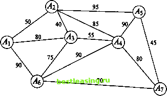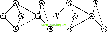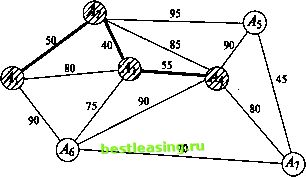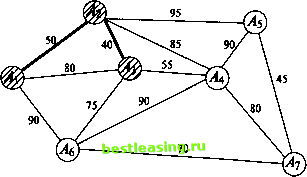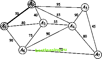 ![]() Рис. 5ж Рис. б Введем одно полезное понятие: множество всех ребер, выходящих из вершины графа, будем называть звездой этой вершины. На рис. 6 изображена звезда вершины А4. Всюду в дальнейшем будем считать, что заданный граф связен, конечен и не имеет петель (начало ни одного ребра графа не совпадает с его концом). Часто приходится рассматривать задачи, в которых каждому ребру заданного графа приписано некоторое положительное (неотрицательное) число (его вес). Обычно граф, нагруженный подобным образом, называют сетью, его вершины узлами, а ребра дугами. В зависимости от приложений описанная числовая нагрузка дуги графа может иметь разный смысл и обозначать длину, стоимость, пропускную способность, временную протяженность и т.д. Рассмотрим несколько характерных задач. 3.2. Минимальное порождающее дерево Предположим заданным граф, числовые нагрузки (веса) дуг которого можно интерпретировать как их длины. Выше уже отмечалось, что порождающих деревьев у графа может быть много. В рассматриваемом случае с каждым порождающим деревом естественно связать число, равное сумме длин всех его дуг. Ясно, что среди этих порождающих деревьев есть хотя бы одно, сумма длин всех дуг которого минимальна. Такое дерево называют минимальным порождающим деревом, minimum scanning tree, или минимальным остовом. Начнем с рассмотрения двух примеров. Пример 1. Имеется 7 городов А\, Аъ A3, Л4, As, As, А7, которые нужно связать между собой наиболее дешевой сетью дорог, если известно, что стоимость с (Ah Ак) сооружения участка дороги, соединяющей города А, и Ак (/, к = 1, 7, к), пропорциональна ее длине (рис. 7). ![]() Рис. 7 Замечание. Граф наиболее дешевой соединяющей сети непременно должен быть деревом. (Если бы это было не так, то в графе нашелся хотя бы один замкнутый путь. При удалении любого из ребер этого замкнутого пути стоимость сети уменьшилась бы, а города все еще оставались соединенными.) Тем самым число ребер искомого графа в предложенном примере должно быть равным 6. Поиск решения можно начать с любого узла. Пусть это будет узел А{. 1-й шаг. Самая короткая дуга, выходящая из этого узла, - это дуга (Аи А2) длины 50. Соединим узлы А{ и А2 жирной линией, как показано на рис. 7а, и пометим узлы Ai и А2. ![]() Рис. 7а 2-й шаг. Самой короткой дугой, выходящей из помеченных узлов А{ и А2 в еще непомеченные, является дуга (А2, Аг) длины 40. Добавим ее к дереву, выделив жирной линией (рис. 76). ![]() Рис. 76 3-й шаг. Узел Ал расположен к тройке Аи A2i А3 ближе всех других непомеченных узлов. Выделив дугу (А3, АО длины 55, переведем этот узел в помеченные (рис. 7в) и пометим узел А+. ![]() Рис. 7в 4-й шаг. Следующим узлом будет узел As, расположенный к помеченной четверке Аи Аъ Л3, А+ ближе непомеченных узлов А5 и А7. Выделим дугу (у43, As) длины 75, соединяющую его с узлом А3 (рис. 7г), и пометим узел As. 5-й шаг. Узел А7, ближе узла А5 к пятерке помеченных узлов. Выделим дугу (As, А7) длины 70, соединяющую его с ближайшим узлом As (см. рис. 7д), и пометим узел А7. 6-й шаг. Оставшийся непомеченным узел А5 соединим с узлом А7 дугой (А5, А7) наименьшей длины 45 (рис. 7е) и также пометим его. Поведем итог: шесть выделенных дуг связывают все семь узлов заданной сети. Получающееся в результате минимальное порождающее дерево имеет суммарную длину 335. 1 2 3 4 5 6 7 8 9 10 [ 11 ] 12 13 14 15 16 17 18 19 20 21 22 23 24 25 26 27 28 29 30 31 32 33 34 35 36 37 38 39 40 41 42 43 44 45 46 47 48 49 50 51 52 53 54 55 56 57 58 59 60 61 62 63 64 65 66 67 68 69 70 71 72 73 74 75 76 77 78 79 80 81 82 83 84 85 86 8