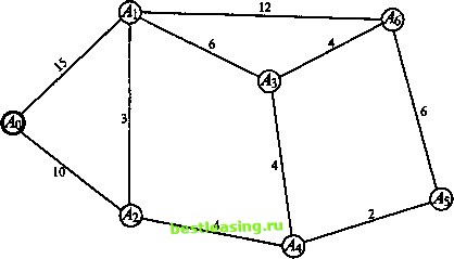 2-й шаг. Каждая из двух помеченных вершин графа порождает свою звезду. Рассмотрим все ребра этих звезд, за исключением тех, которые соединяют между собой уже помеченные вершины, выберем ребро наименьшей длины (если таких ребер несколько, выбираем любое из них) и пометим вершину, в которую входит это выбранное ребро. В результате выделенными оказываются два ребра графа, а помеченными уже три его вершины. Обозначим полученное дерево через . Ясно, что С . Если других вершин в графе нет, то искомое порождающее дерево построено и поставленная задача решена. В противном случае потребуется новый шаг. 3-й шаг. Каждая из трех помеченных вершин графа порождает свою звезду. Рассмотрим все ребра этих звезд, за исключением тех, которые соединяют между собой уже помеченные вершины, выберем ребро наименьшей длины (если таких ребер несколько, выбираем любое из них) и пометим вершину, в которую входит это выбранное ребро. В результате выделенными оказываются три ребра графа, а помеченными уже четыре его вершины. Обозначим полученное дерево через Т\ С % С Тъ. Если других вершин в графе нет, то искомое порождающее дерево построено и поставленная задача решена. В противном случае потребуется новый шаг. На каждом шаге и число выделенных ребер графа, и число помеченных вершин увеличиваются ровно на единицу. Тем самым, после п - 1-го шага количество выбранных ребер станет равным п - 1 и все п вершин графа окажутся помеченными. Обозначим полученное дерево через .£ ь ?CJ5C...CJC.i. Замечание. Первый шаг можно начинать с ребра наименьшей длины. Его легко найти путем простого перебора всех ребер графа. Если таких ребер несколько, выберем любое из них и пометим концы выбранного ребра. В результате две вершины графа окажутся помеченными. Если других вершин в графе нет, то искомое порождающее дерево построено и поставленная задача решена. В противном случае потребуется новый шаг, совпадающий со 2-м шагом алгоритма, предложенного выше [9]. Обоснование корректности алгоритма Обоснование корректности приведем для сети, в которой нет дуг равной длины (это условие кажется ограничительным лишь на первый взгляд; в реальных обстоятельствах длины разных отрезков проектируемой сети дорог хотя бы немного, но различаются). Итак, возьмем сеть с п узлами, обозначим через J* ее остов минимальной длины и покажем, что дерево Тп-и построенное описанным выше способом, непременно с ним совпадает* Априори возможны еще два случая: 1-й - дерево 3~ -1 целиком содержится в остове Г* (но, разумеется, не совпадает с ним Тп-{ * Г*) и 2-й - у дерева Tn i есть дуга, которой нет в остове Т*. Проведем рассуждения, исключающие оба эти случая. Случай 1-й. Если дерево Тп.х целиком лежит в остове Я8, то сумма длин всех его дуг оказывается меньше суммы всех дуг минимального остова Т*, что невозможно. Случай 2-й. Пусть а - дуга дереваТп ь не принадлежащая остовуТ*. По построению дерева i дуга а появляется на одном из шагов алгоритма. Предположим для определенности, что на к-м. Это означает, что у дерева Тк-{ ее еще нет, а у дерева Тк она уже есть. Напомним, как проводится к-й шаг. Приступая к нему, мы ищем дугу наименьшей длины, которая соединяла бы один из помеченных узлов дерева5-i с еще непомеченным на этот момент узлом исходной сети. Пусть это узлы А и В соответственно. Вследствие того, что остов Т* содержит все узлы исходной сети и связен, 