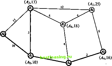 Таким образом, по окончании 3-го шага узлы Д>, Аи А2и А4 имеют постоянные метки, узлы А3пАь временные, а узел А5 никаких меток пока не имеет (рис. 10д). ![]() U2,14> Рис. 10д Таблица 3 В таблице 3 указаны длины маршрутов от узла Д>, полученных на первых трех шагах; жирным выделены длины окончательных (т. е. самых коротких) маршрутов. 4-й шаг. Отбираются все узлы, которые соединены с узлом А4 одной дугой и не имеют постоянных меток. Это узлы Аг и А5. Присваиваем узлу А5 временную метку (ЛЦ, 16). Сравнивая метки (Аь 19) и (А, 18), замечаем, что расстояние от узла Ао до узла A3 по пути, проходящем через узел Аа, меньше расстояния по пути, проходящем через узел А\. Это наблюдение дает основание заменить метку (Аи 19) на более выгодную метку (А4, 18) (рис. 10е). Обратимся к узлам, имеющим временные метки, - это узлы А3, А5 и Аь. Сравнивая расстояния от узла Д> до этих узлов, замечаем, что самым коротким будет путь до узла А5. Это означает, что любой другой маршрут из узла Д, в узел А5 будет длиннее. ![]() U2,14> Рис. 10е Таким образом, по окончании 4-го шага узлы Д>, Аи А2, А4 и А5 имеют постоянные метки, а узлы А3 и Ав временные (рис. 10ж). ![]() U2,14> Рис. 10ж Таблица 4 В таблице 4 указаны длины маршрутов от узла Ао, полученных на первых четырех шагах; жирным выделены длины окончательных (т. е. самых коротких) маршрутов. 5-й шаг. Отбираются все узлы, которые соединены с узлом А5 одной дугой и не имеют постоянных меток. Это узел А$. Сравнивая метки (Ах, 25) и (А5, 22), замечаем, что расстояние от узла Ао до узла Аб по пути, проходящему через узел А5, меньше расстояния по пути, проходящему через узел Ах. Это наблюдение дает основание заменить метку (Аи 25) на более выгодную метку (А5, 22) (рис. Юз). ![]() U2,14> Рис. Юз Обратимся к узлам, имеющим временные метки, - это узлы Аъ и Д. Сравнивая расстояния от узла Д> до этих узлов, замечаем, что самым коротким будет путь до узла Ау Это означает, что любой другой маршрут из узла Ао в узел Д* будет длиннее. Таким образом, по окончании 5-го шага узлы Ао, Аи А2, А3, А4 и А5 имеют постоянные метки, а узел Аь временную метку (рис. 10и). Таблица 5