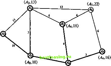 ![]() 0*2,14) Рис. 10и В таблице 5 указаны длины маршрутов от узла Ао, полученных на первых пяти шагах; жирным выделены длины окончательных (т. е. самых коротких) маршрутов. б-й шаг. Узел А - последний узел с временной меткой (А5, 22). Она становится постоянной вследствие того, что путь в узел А$, проходящий через узел А3, получивший постоянную метку на предыдущем шаге, имеет ту же длину - 22 и менять ее на новую нецелесообразно. Таким образом, по окончании 6-го шага все узлы имеют постоянные метки (рис. 10к). ![]() Таблица 6