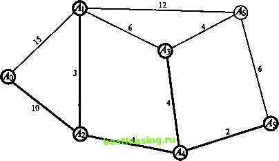 В таблице 6 указаны длины кратчайших маршрутов (они выделены жирным) от узла Д> до каждого из остальных узлов сети. Замечание. На каждом шаге временная метка одного из узлов меняет свой статус на постоянную по следующему правилу: рассматриваются все узлы с временными метками и выбирается тот из них, расстояние до которого от узла Д> является наименьшим. Обратный ход Используя вторую компоненту метки, определяем последовательность узлов в каждом кратчайшем маршруте. Например: метка (А5, 22) узла А$ указывает на предшествующий узел А5, метка (Аа, 16) узла А5 указывает на предшествующий узел Аа, метка (А2, 14) узла А4 указывает на предшествующий узел Аъ метка (Ао, 10) узла А2 указывает на исходный узел Ао. В результате, обратная последовательность узлов кратчайшего маршрута от узла Ао к узлу Аь имеет вид А6->А5->А4->А2->Ао Ответ: